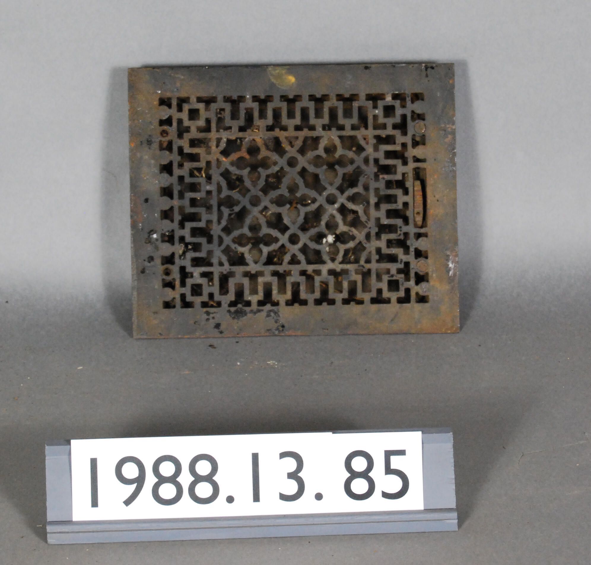 Cast iron. Rectangular grille. Has quartrefoil / circular / geometric decoration. Lever knob. missing. Has adjustable Louvers. Originally painted black.