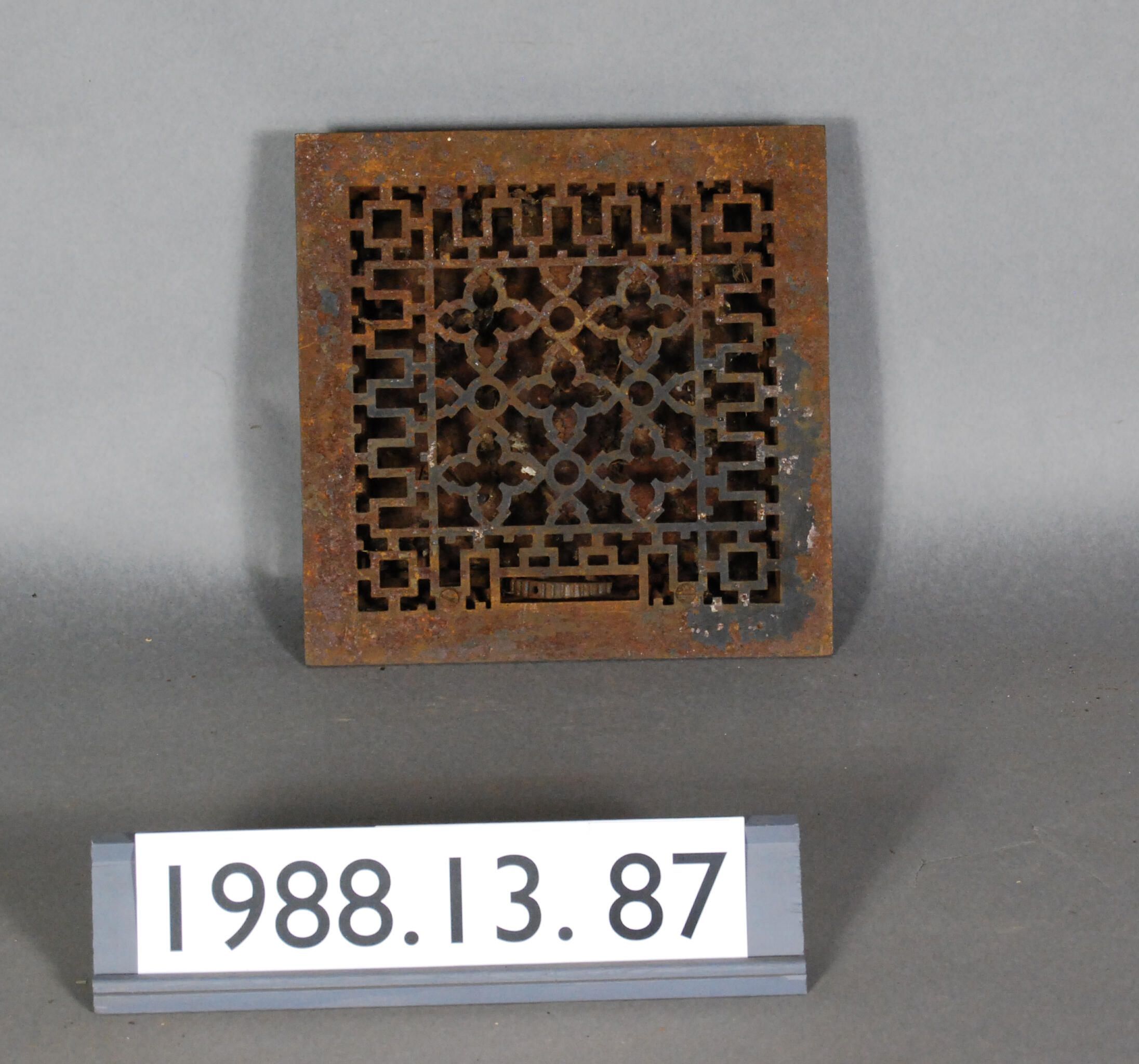 Cast iron. Square grille. Has quartrefoil / circular / geometric decoration. Lever Knob missing. Has three adjustable Louvers. Originally painted black.