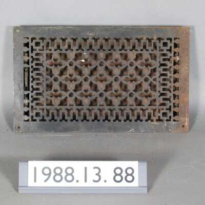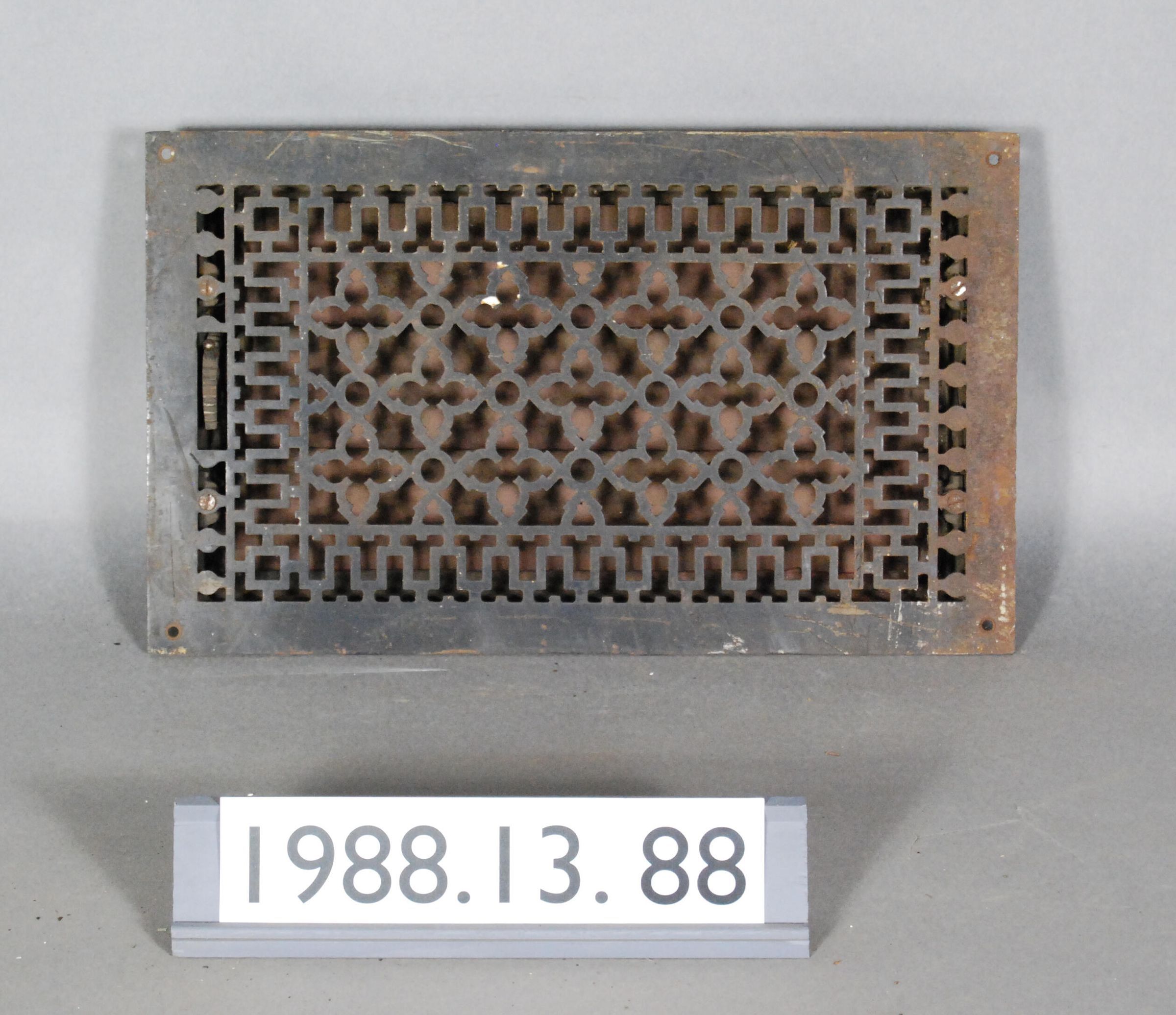 Cast iron. Rectangular grille. Has quartrefoil / circular / geometric decoration. Has Lever Knob. Has three adjustable Louvers. Originally painted black.