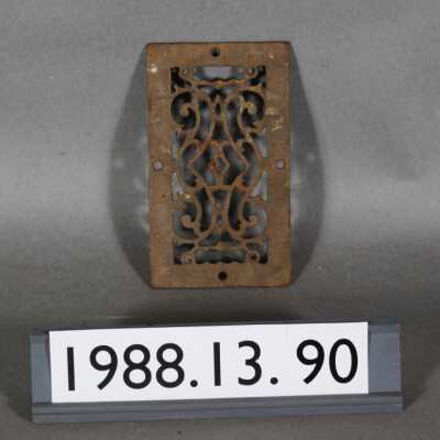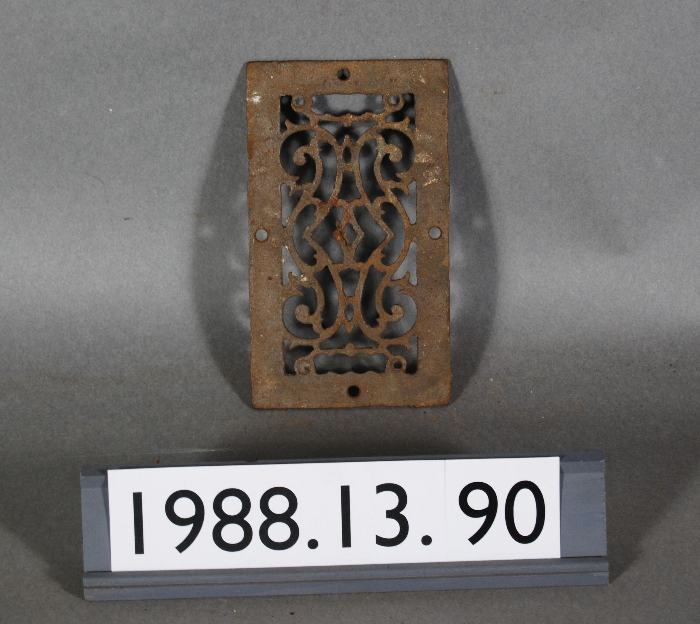 Cast iron. Rectangular grille with filligree French curved / geometric / stylized botanical design motif. Slot at each end. No Louvers. Inscriptions or Markings: Manufacturer: Place of Manufacturer: Design motif: Style: Finish: