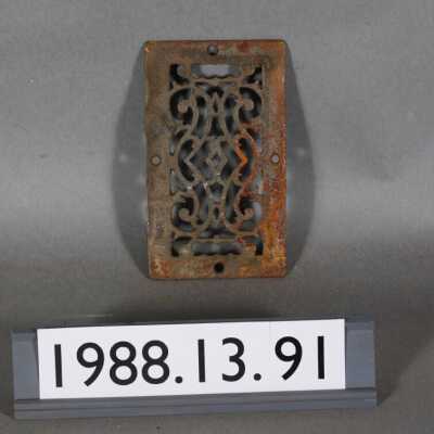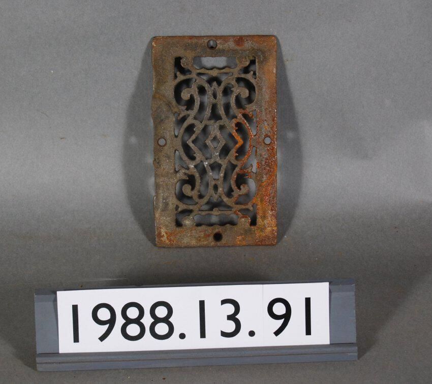 Cast iron. Rectangular grille with filligree French curved / geometric / stylized botanical design motif. Slot at each end. No Louvers. Inscriptions or Markings: Manufacturer: Place of Manufacturer: Design motif: Style: Finish: