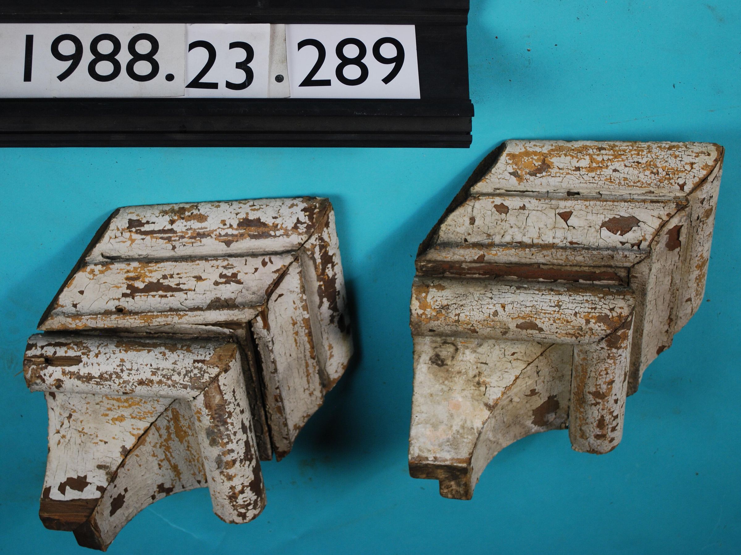One lot of two exterior wood corner trim parts. Composed of moldings with mitered corners. Originally related to 1988.23.288. Painted white.