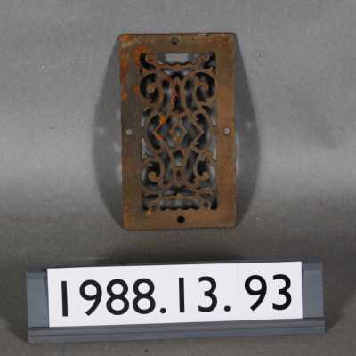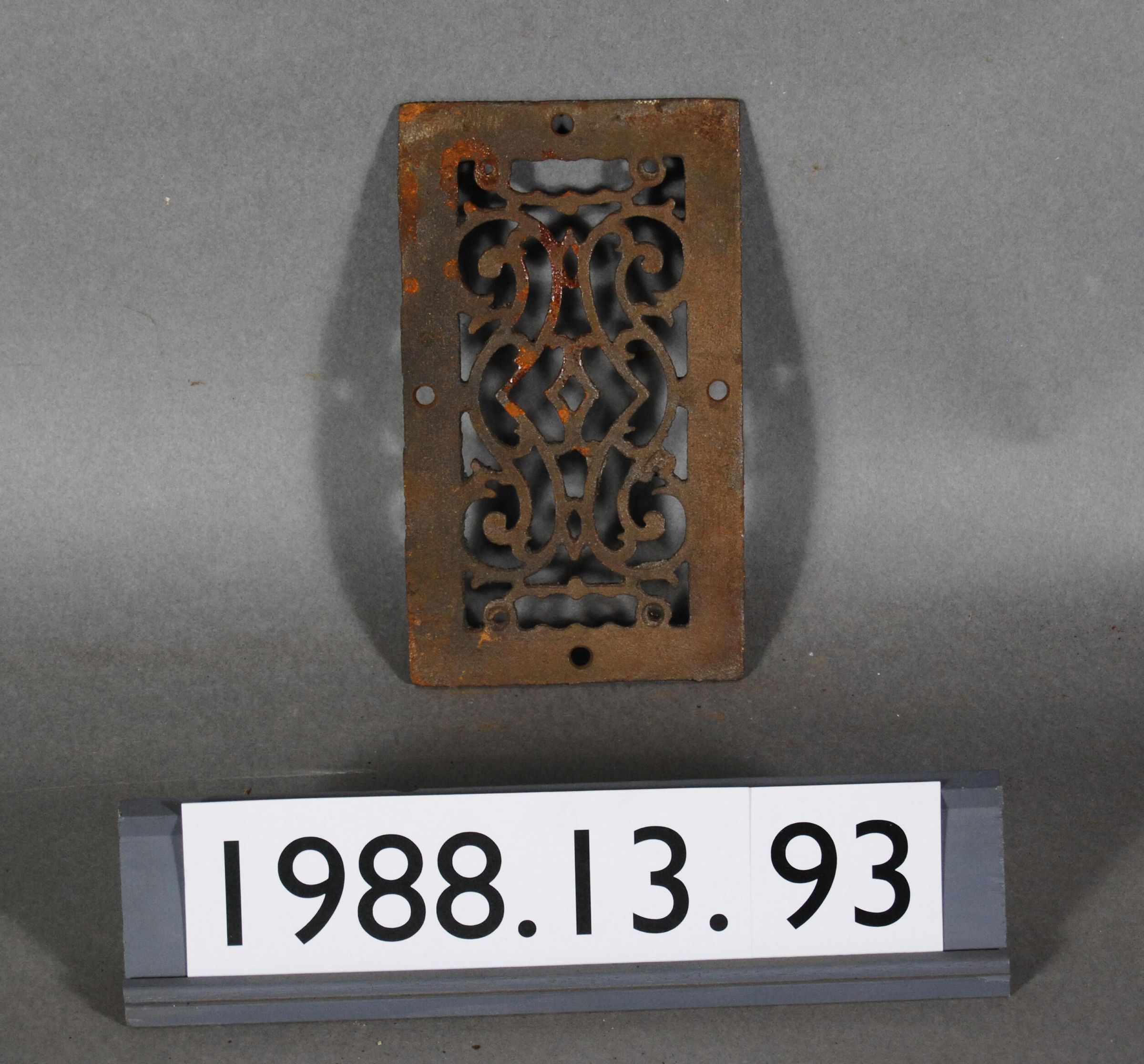Cast iron. Rectangular grille with filligree French curved / geometric / stylized botanical design motif. Slot at each end. No Louvers. Inscriptions or Markings: Manufacturer: Place of Manufacturer: Design motif: Style: Finish: