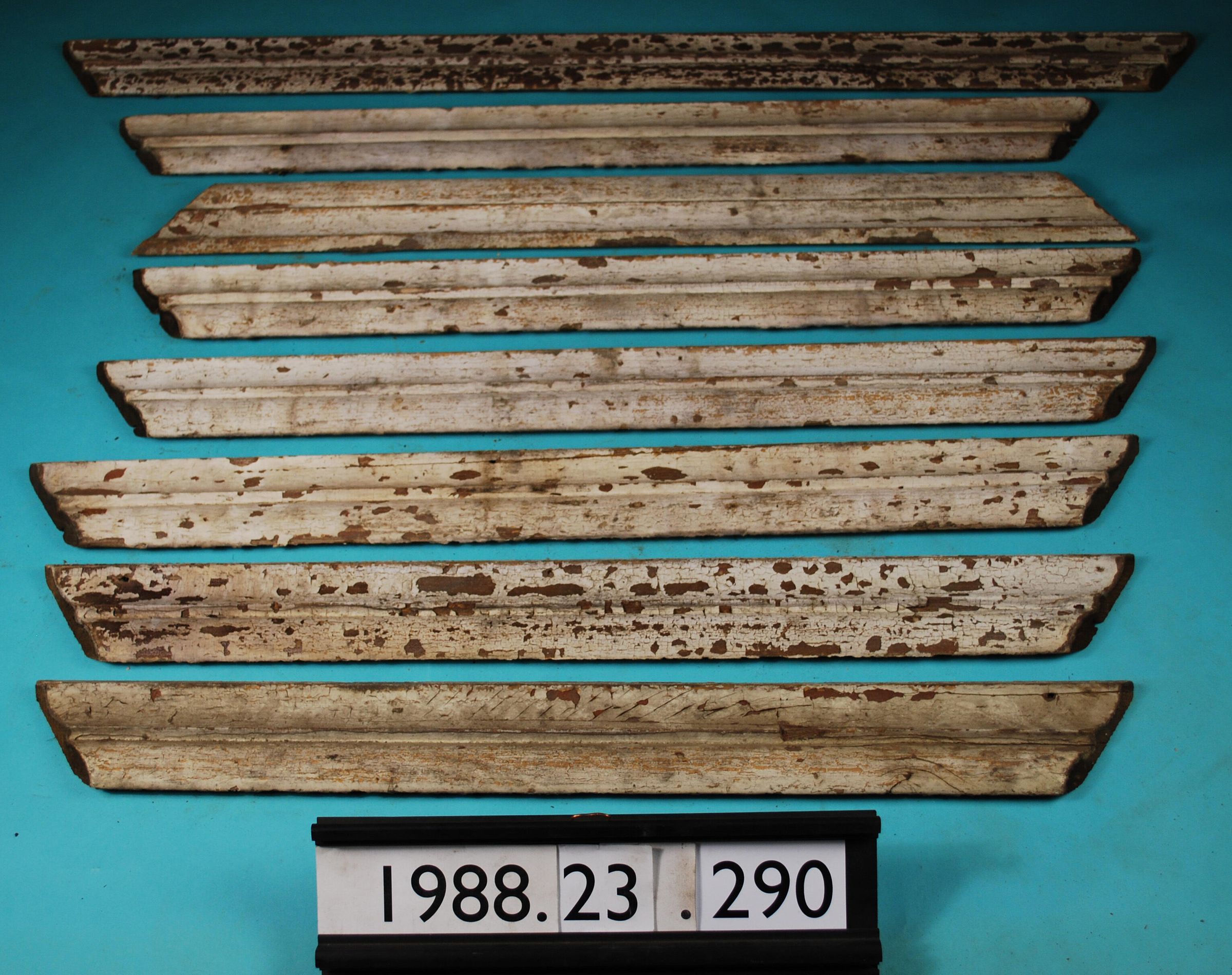 One lot of eight exterior wood moldings. Possibly associated with 1988.23.288-1988.23.290. (Cornice?). Painted white. Inscriptions or Markings: Manufacturer: Place of Manufacturer: Design motif: Style: Finish: Painted White