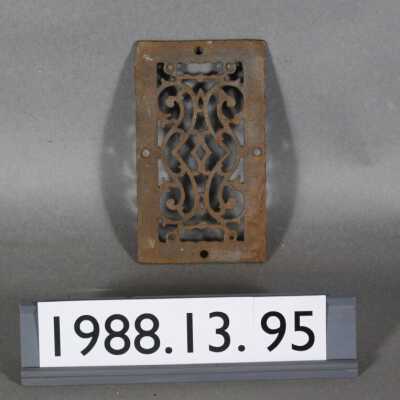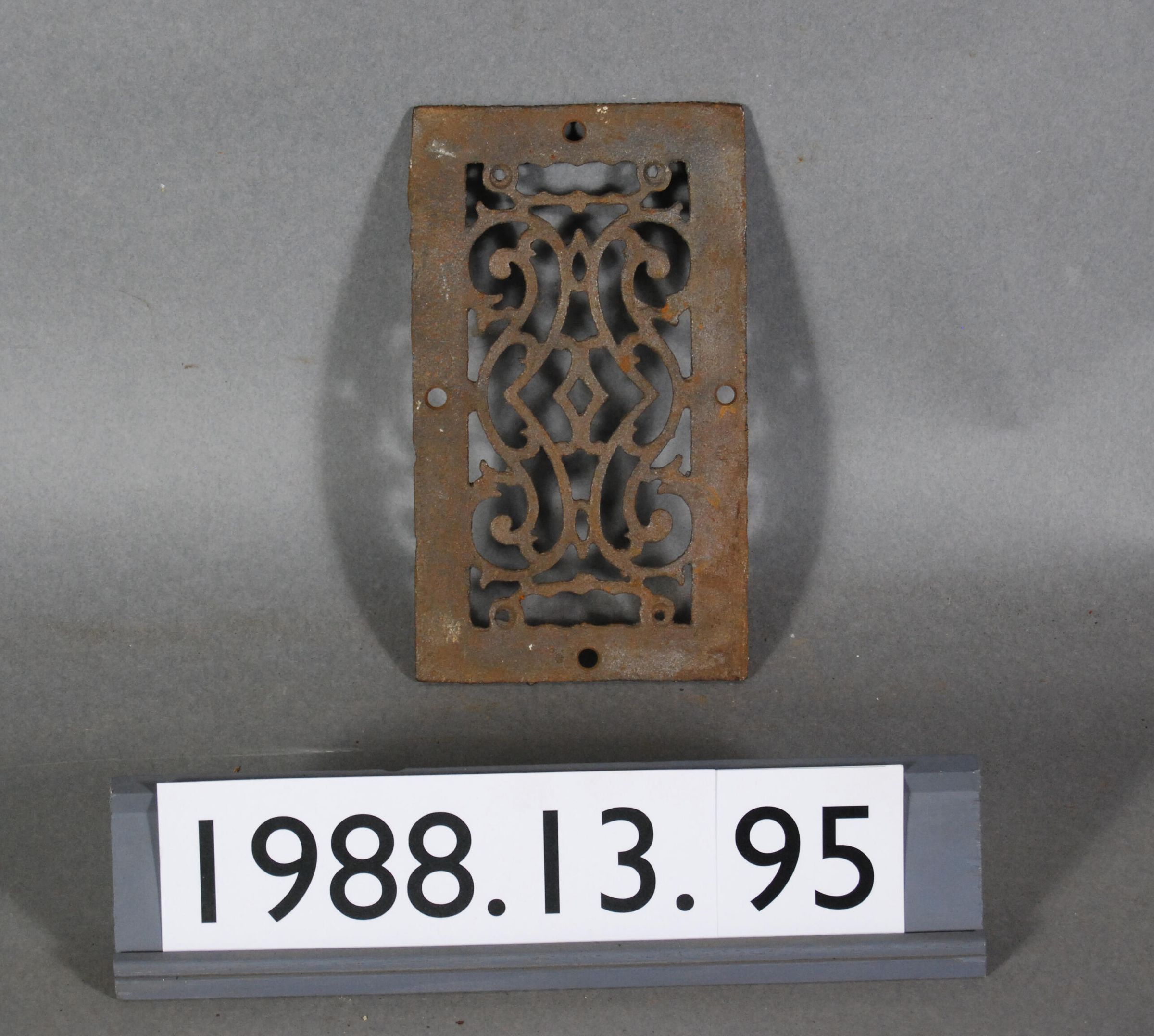 Cast iron. Rectangular grille with filligree French curved / geometric / stylized botanical design motif. Slot at each end. No Louvers. Inscriptions or Markings: Manufacturer: Place of Manufacturer: Design motif: Style: Finish: