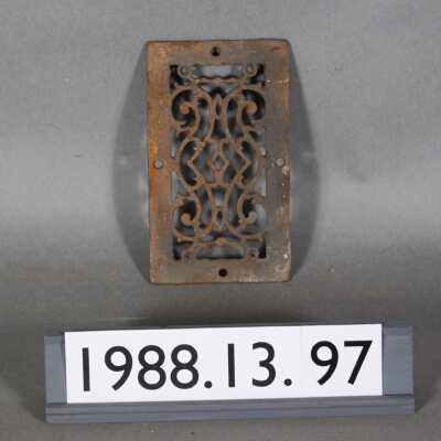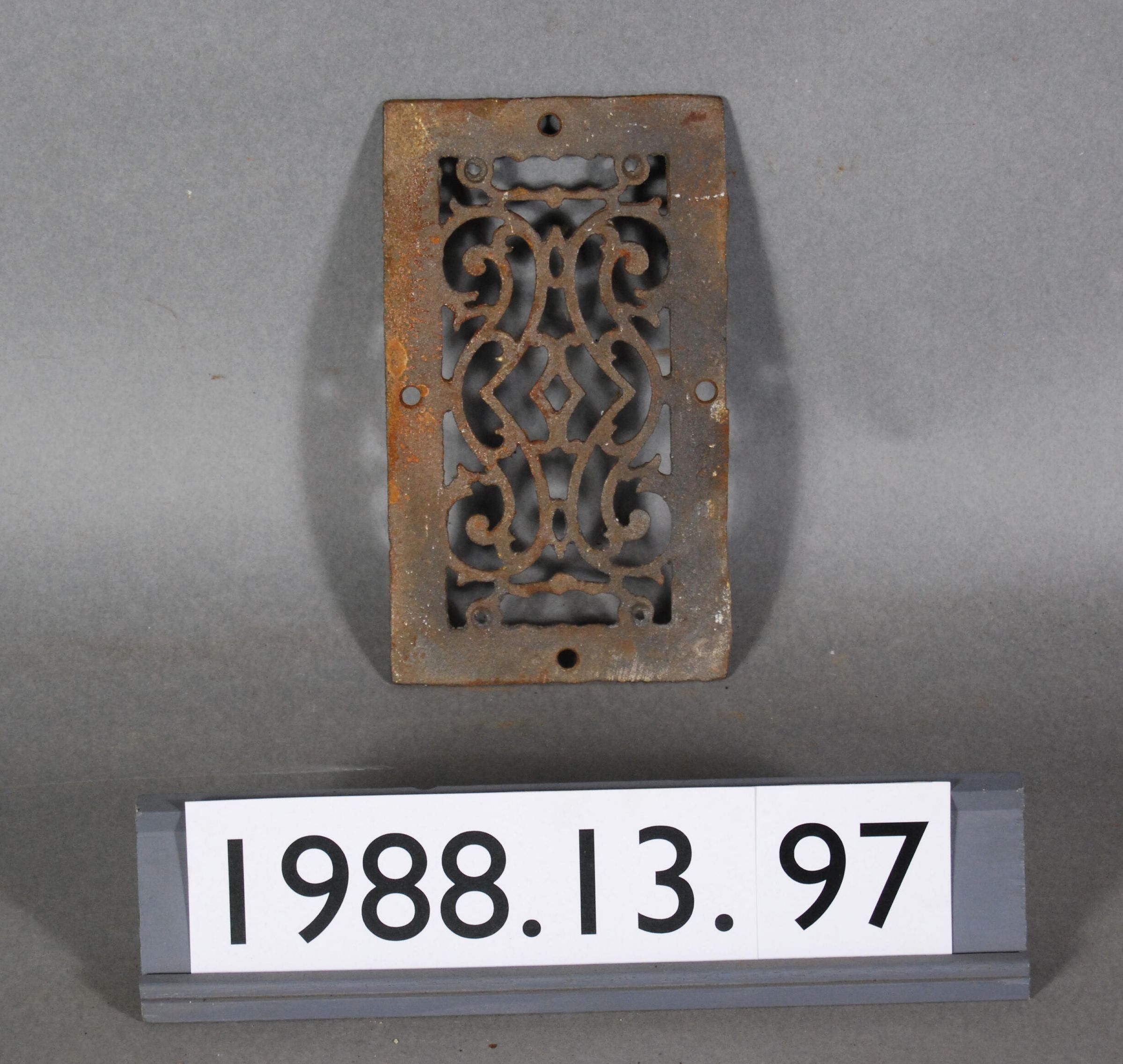 Cast iron. Rectangular grille with filligree French curved / geometric / stylized botanical design motif. Slot at each end. No Louvers. Inscriptions or Markings: Manufacturer: Place of Manufacturer: Design motif: Style: Finish:
