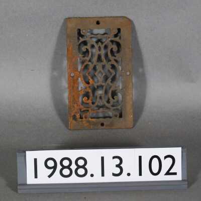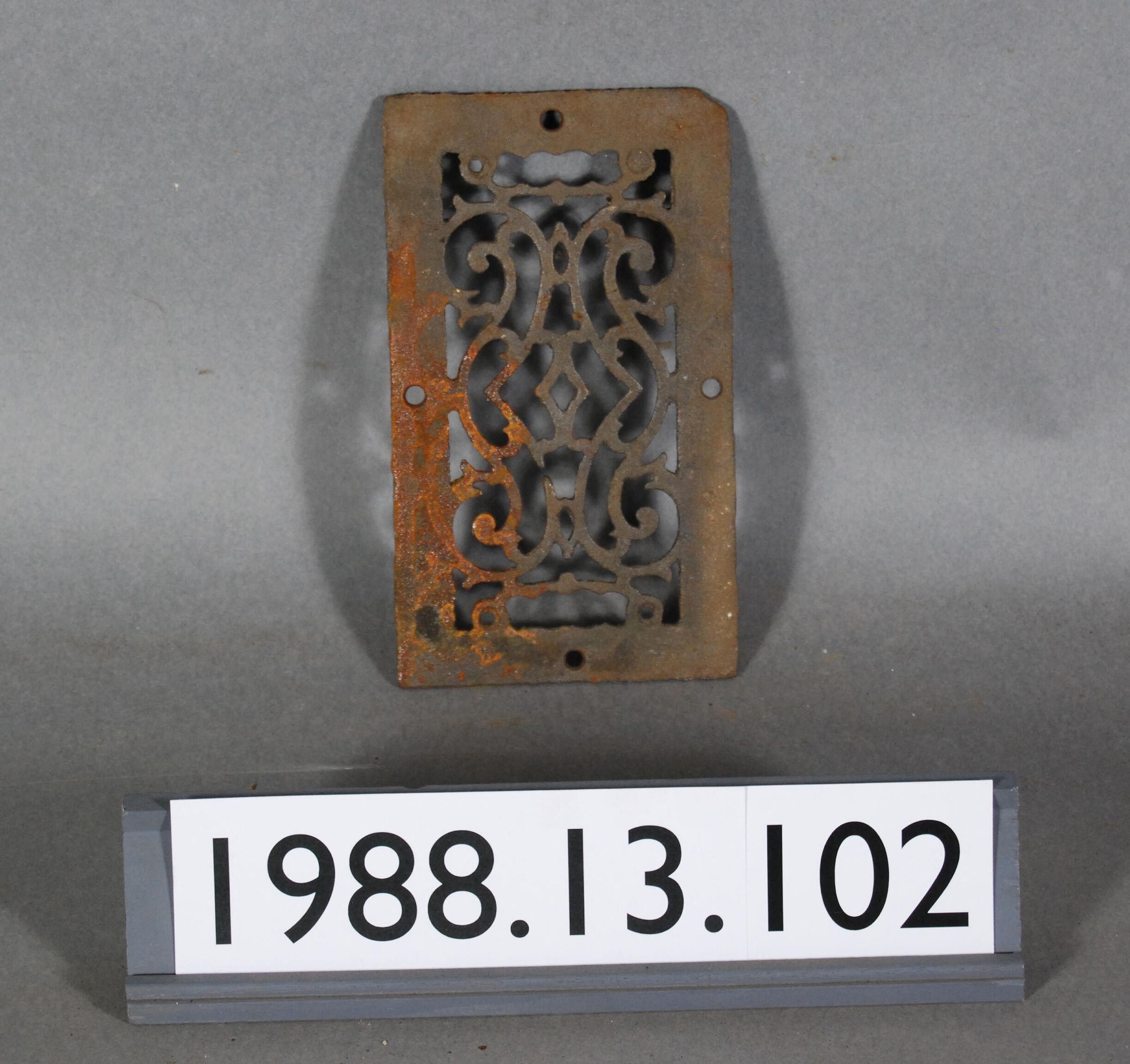 Cast iron. Rectangular grille with filligree French curved / geometric / stylized botanical design motif. Slot at each end. No Louvers. Corner missing. Fret missing.