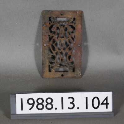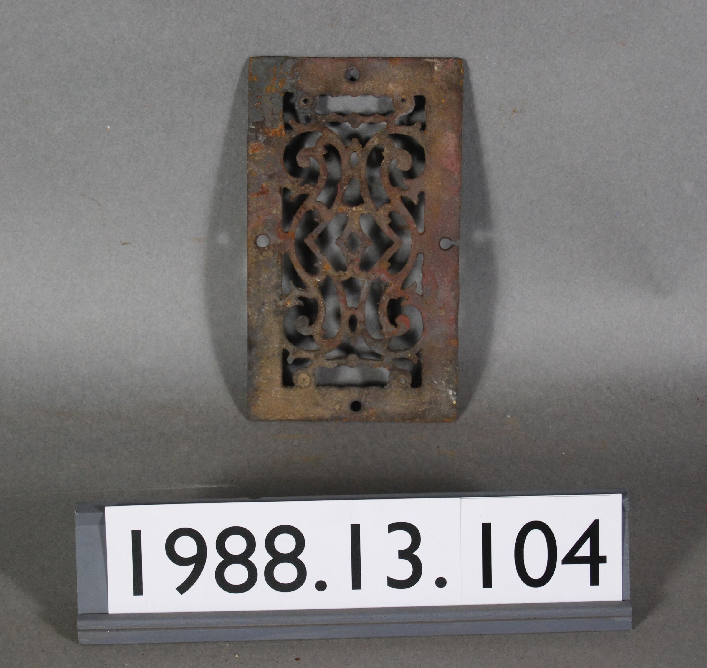 Cast iron. Rectangular grille with filligree French curved / geometric / stylized botanical design motif. Slot at each end. No Louvers. Inscriptions or Markings: Manufacturer: Place of Manufacturer: Design motif: Style: Finish: