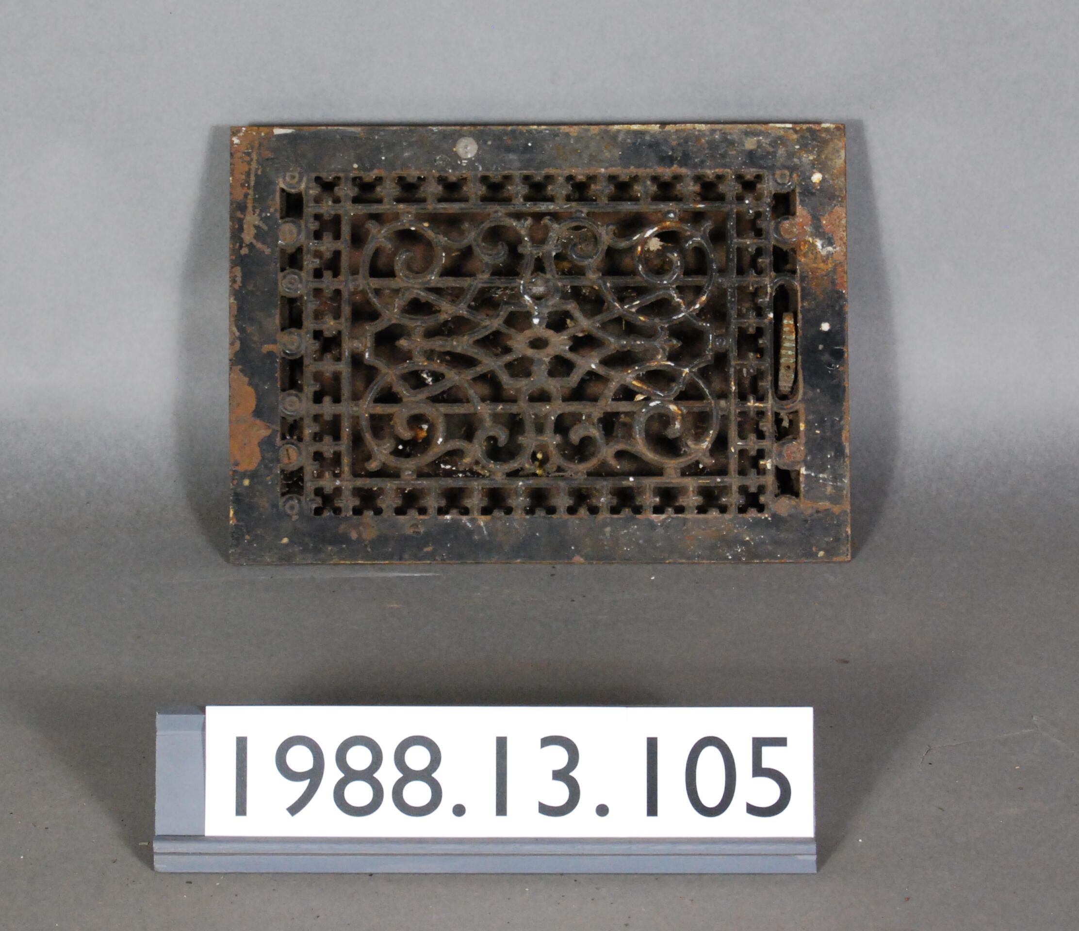Cast iron. Rectangular, grille has filligree / stylized botanical design motif. Painted black. Lever knob missing. Cracked frame. Inscriptions or Markings: Tuttle & Bailey M.F.G. Co. NY Patented Aug 3, 1886 8 / 12 Manufacturer: Tttle & Bailey. Place of Manufacturer: New York. Design motif: Style: Finish: Painted