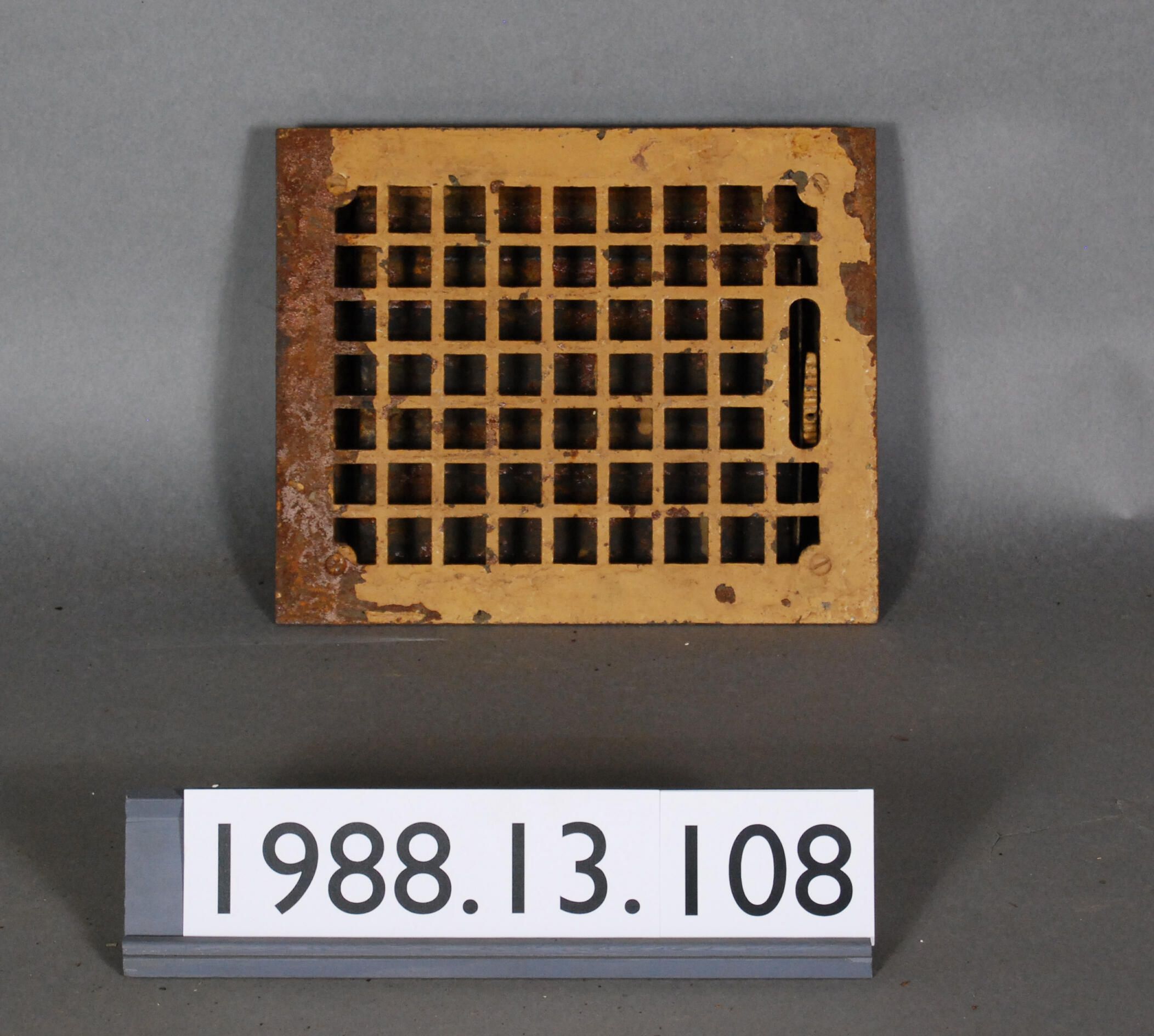 Cast iron. Rectangular grille. Plain square grid. Over-painted tan/brown. Lever knob missing. Has four steel adjustable louvers. Inscriptions or Markings: Manufacturer: Place of Manufacturer: Design motif: Style: Finish: Painted