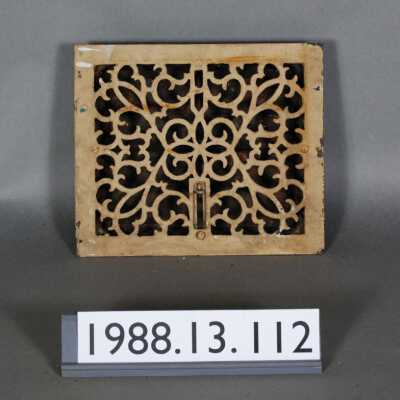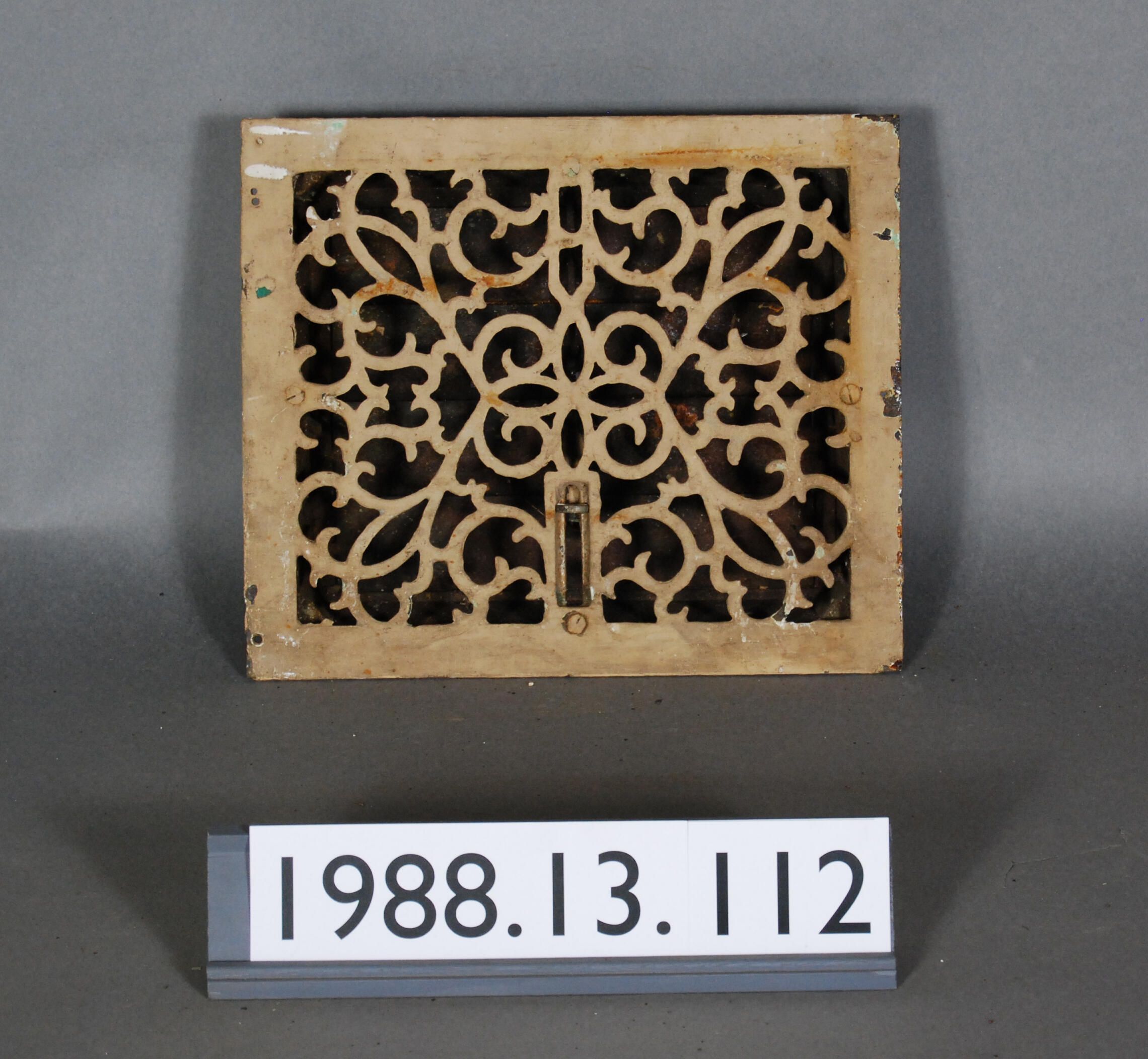 Cast iron rectangular grille with filligree stylized botanical / geormetric design motif. Beige over original black. Sliding lever. Four adjustable louvers. (Frame has drilled holes, altered).
