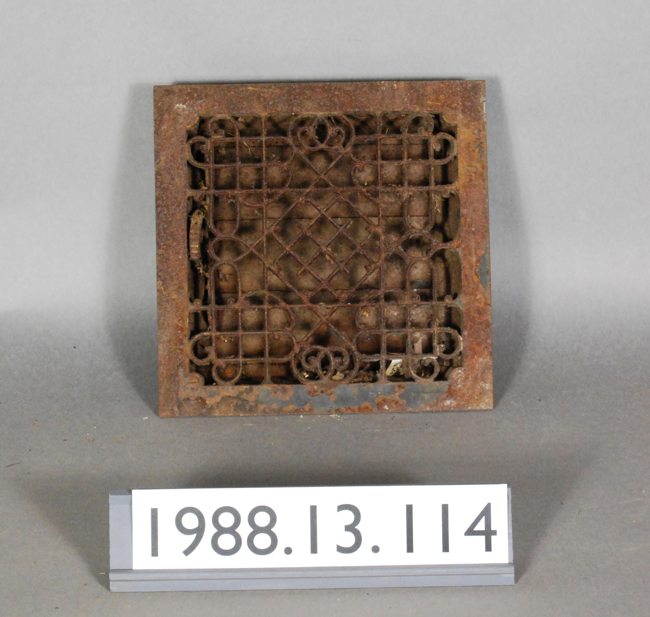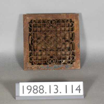 Cast iron rectangular grille with filligree stylized botanical / geormetric design motif. Originally Japanned black. Lever knob missing. Three louvers.