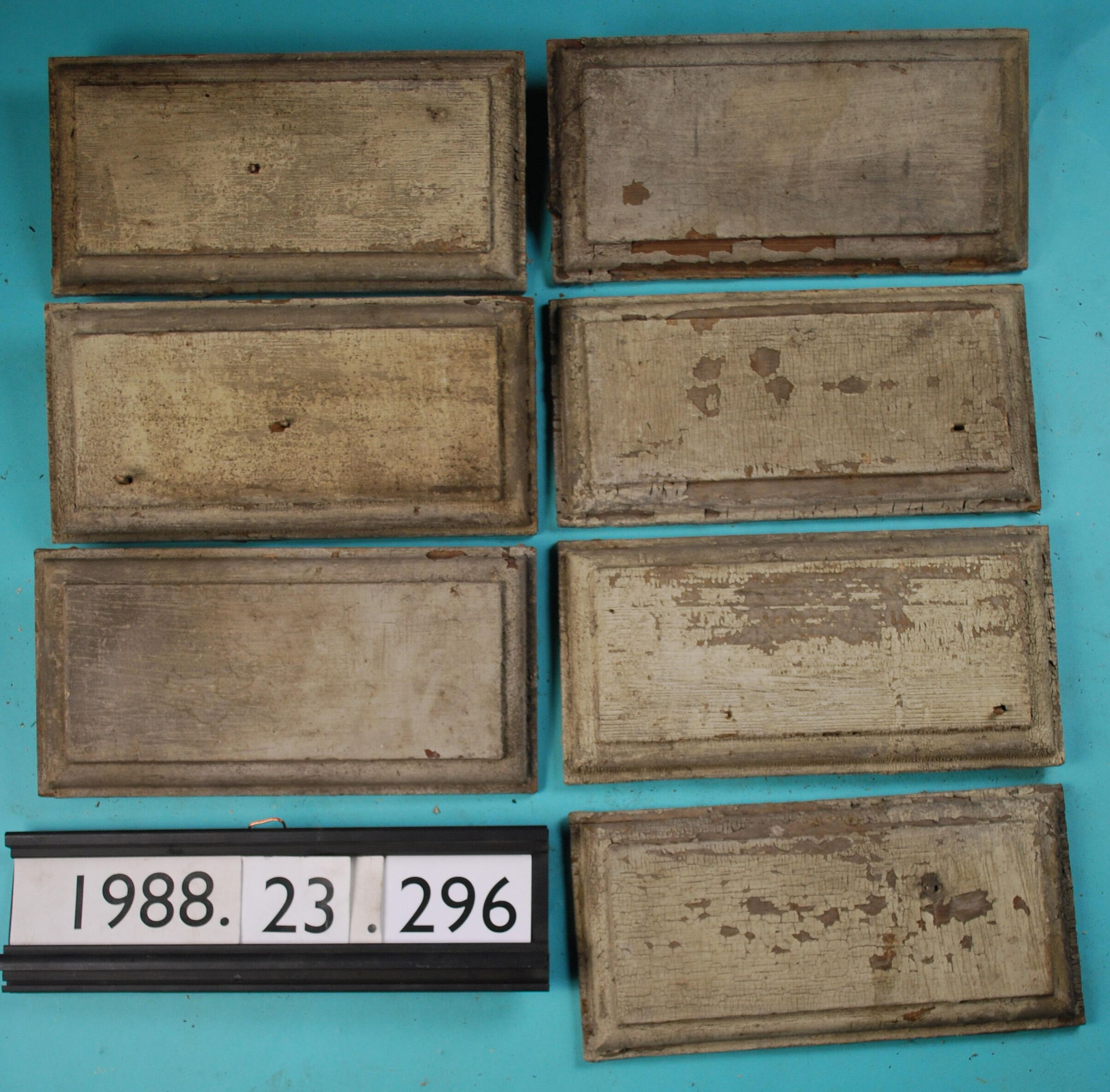 One lot of seven exterior wood panels. Painted beige / yellow. Inscriptions or Markings: Manufacturer: Place of Manufacturer: Design motif: Style: Finish: Painted Beige / Yellow