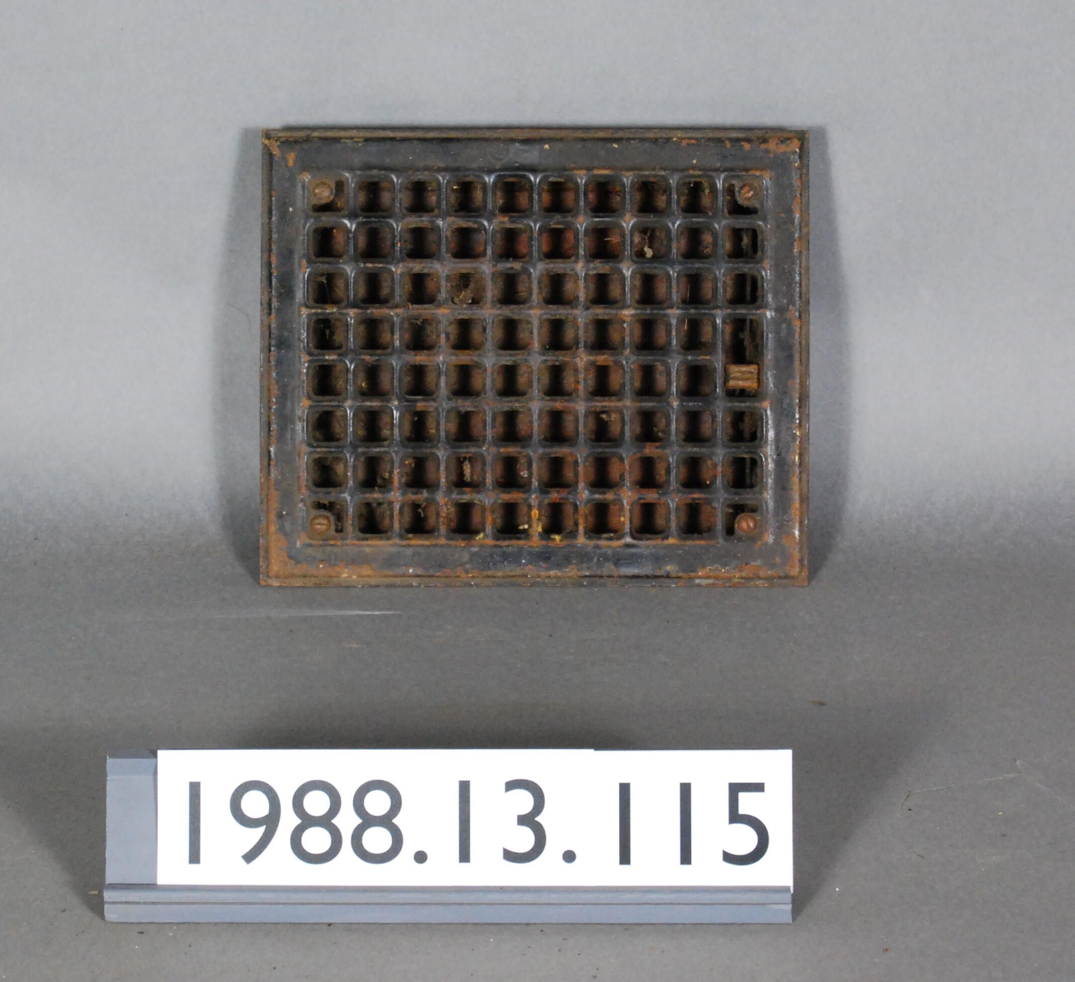 Stamped sheet iron grille with square grid. Originally Japanned black. Four adjustable louvers. Inscriptions or Markings: Manufacturer: Place of Manufacturer: Design motif: Style: Finish: Painted.