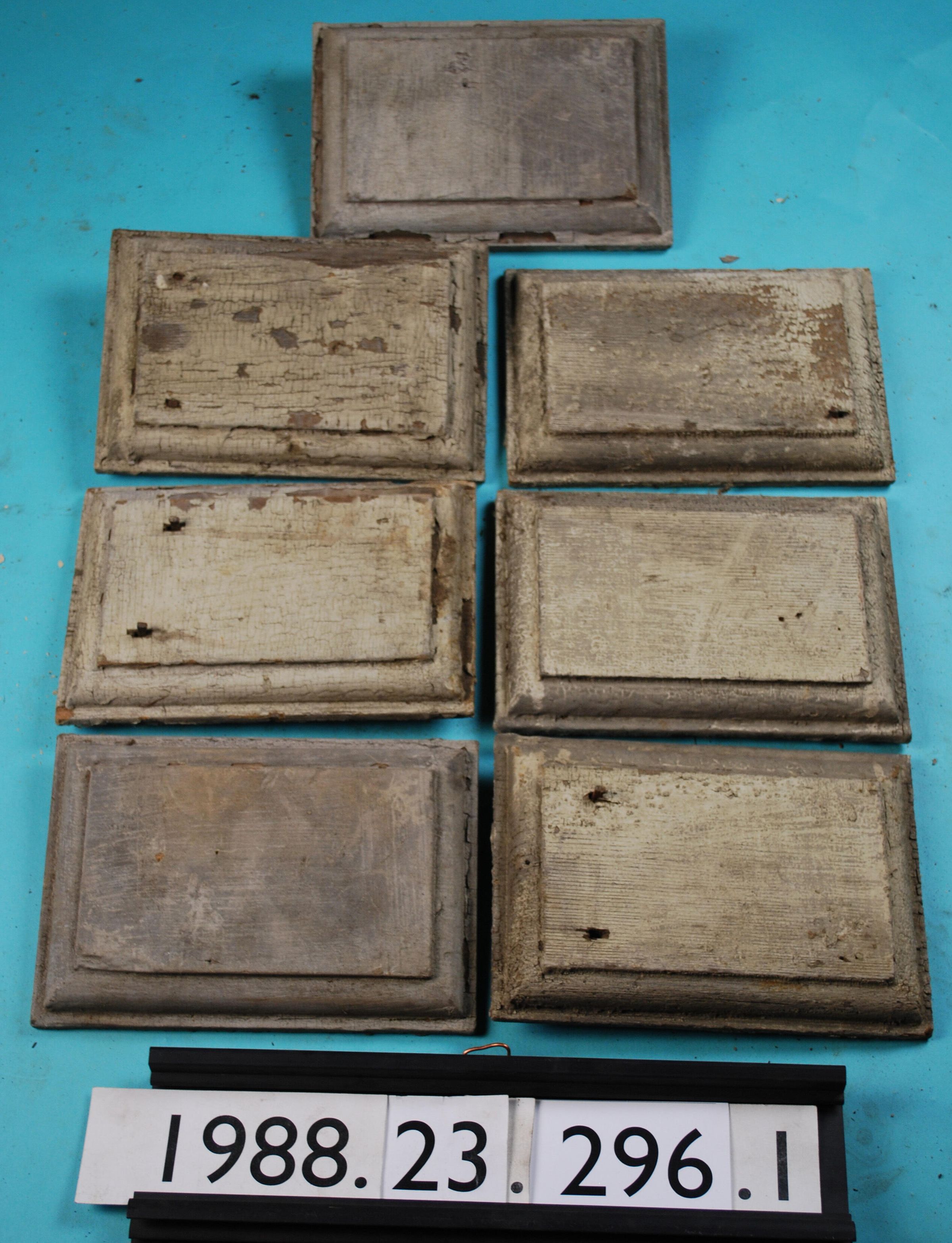 One lot of seven exterior wood panels. Painted beige / yellow. Inscriptions or Markings: Manufacturer: Place of Manufacturer: Design motif: Style: Finish: Painted Beige / Yellow