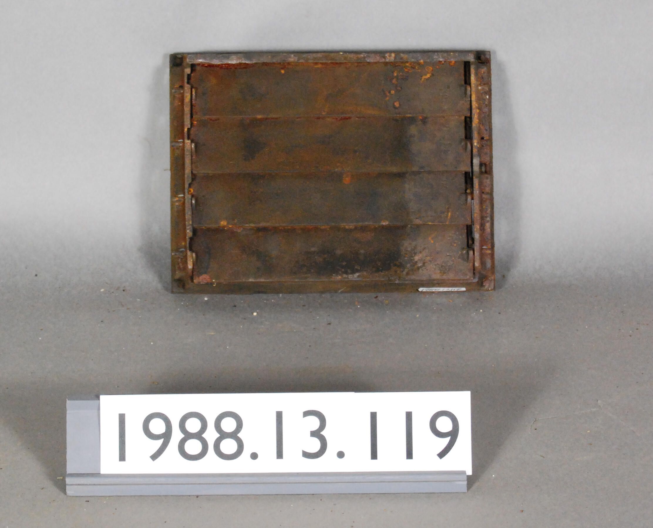 Rectangular register frame (no grille). Inscriptions or Markings: Pat. Applied 9/12. Manufacturer: Place of Manufacturer: Design motif: Style: Finish: