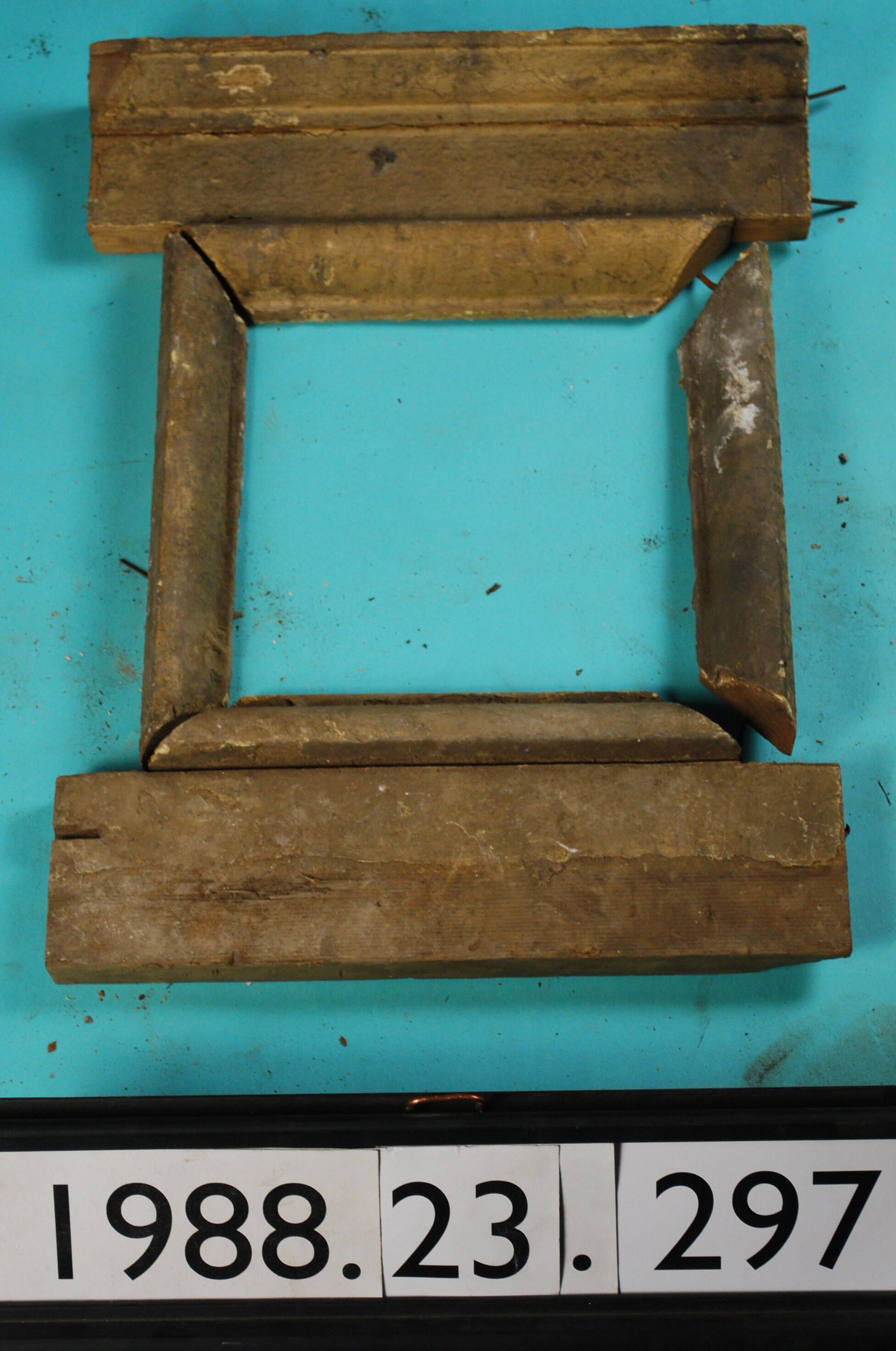 Exterior wood moldings. Mitred ends. Probably originally associated with panel. (Actual panel is missing). Painted. Inscriptions or Markings: Manufacturer: Place of Manufacturer: Design motif: Style: Finish: Painted