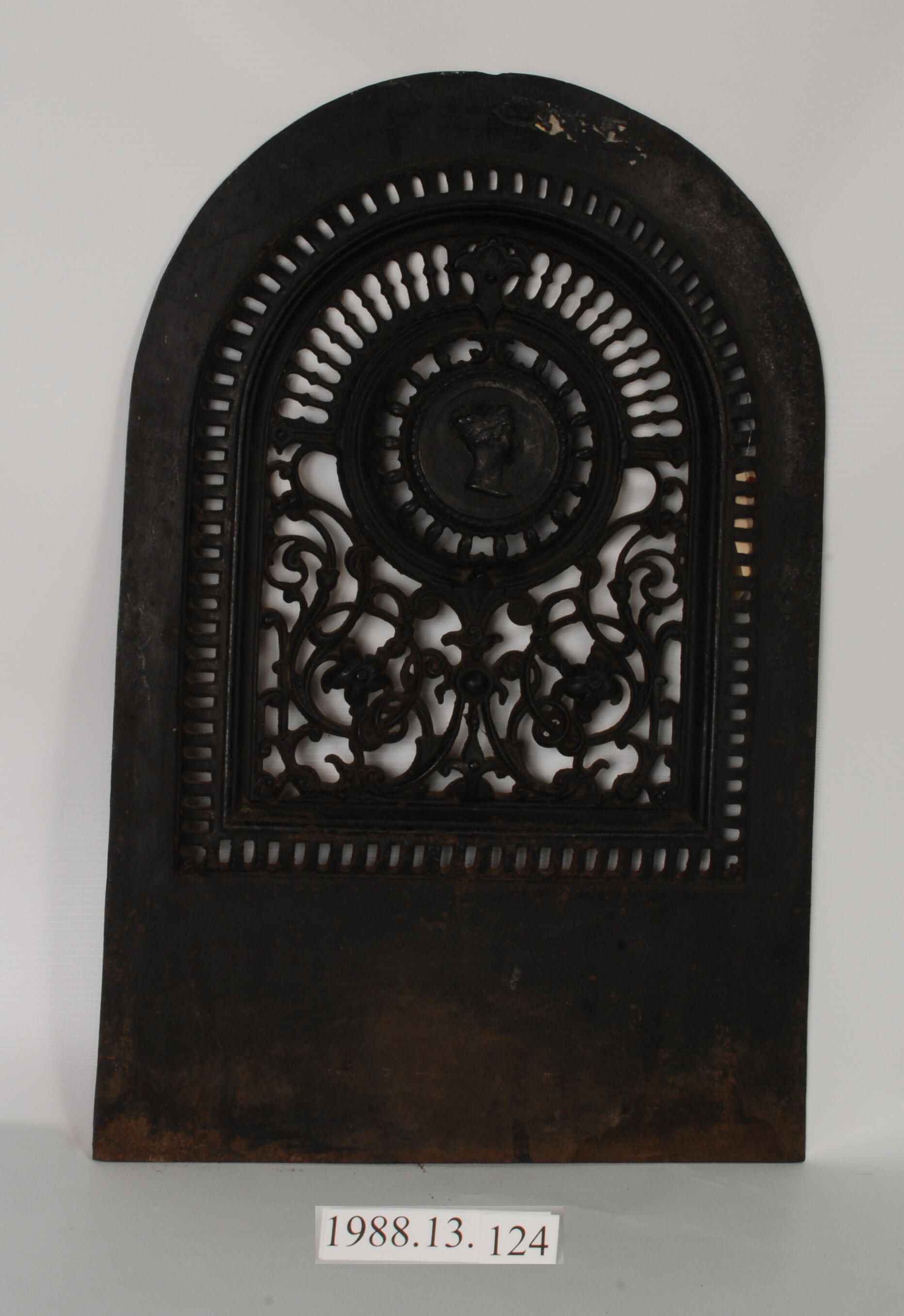 Cast iron fireplace cover/grille. Upper part arched. Lower part rectangular. Designed to fit inside a fireplace frame. Has grill with filligree botanical design / geometric design. Circular center. Embossed Relief profile of female figurehead.
