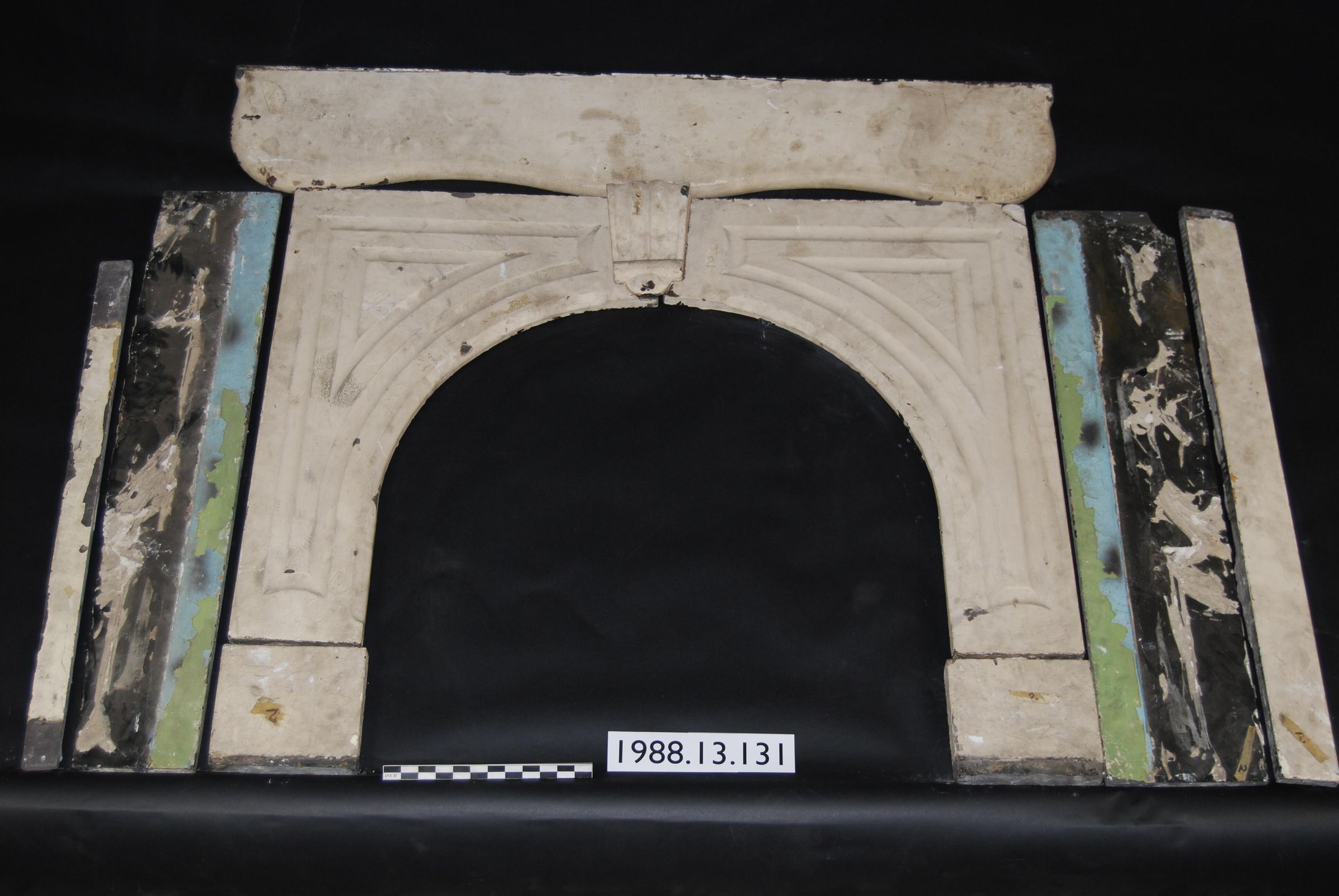 Disassembled, nearly complete, faux marbleized slate ( painted white). Two pieces form arched fireplace opening with carved panels, central carved keystone. Has plinth block at each respective side. Mantel shelf has serpentine molded edge. Has associated side and face pieces (ten pieces altogether).