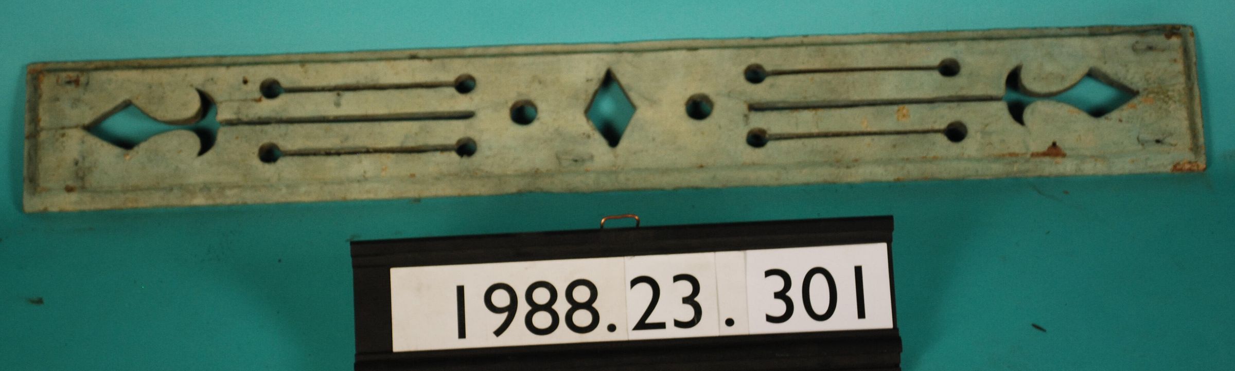 Exterior wood rectangular panel with fret-cut pierced ornamentation. Painted green. Inscriptions or Markings: Manufacturer: Place of Manufacturer: Design motif: Style: Finish: Painted Green