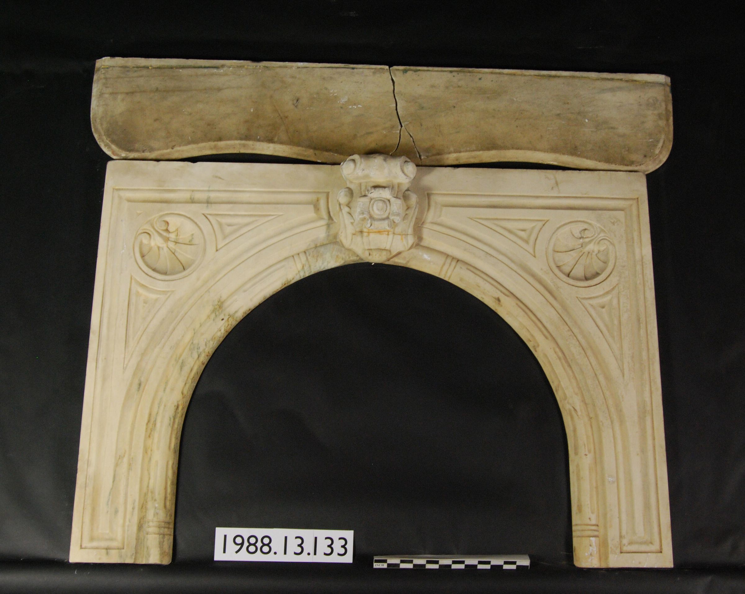 Disassembled. Nearly complete. White marbel mantel. Has serpentine edged shelf (broken). Two piece lintel forms. Arched fireplace opening. Carved panels with stylized scalloped shell motif. Central carved rococo style keystone.