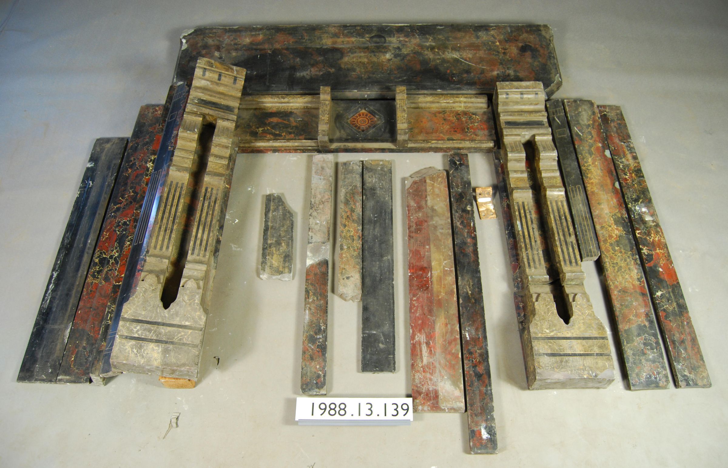 Bracket at top of each pilaster. Block bases. Side / angle pieces attached to one pilaster. Other pilaster broken.