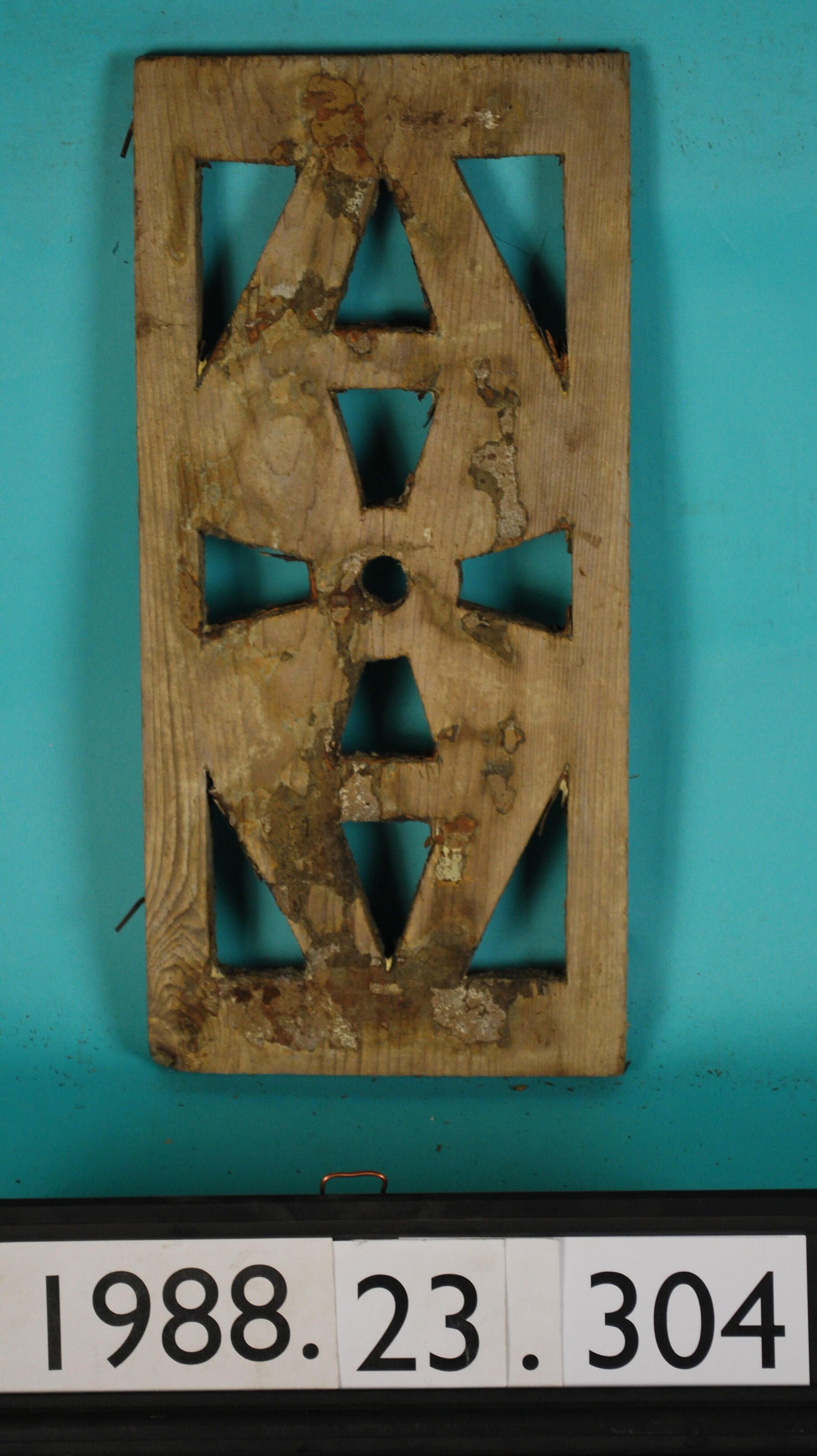 Exterior wood applied rectangular panel. Has fret-cut geometric ornamentation. Remnants of paint. Inscriptions or Markings: Manufacturer: Place of Manufacturer: Design motif: Style: Finish: Remnants of Paint