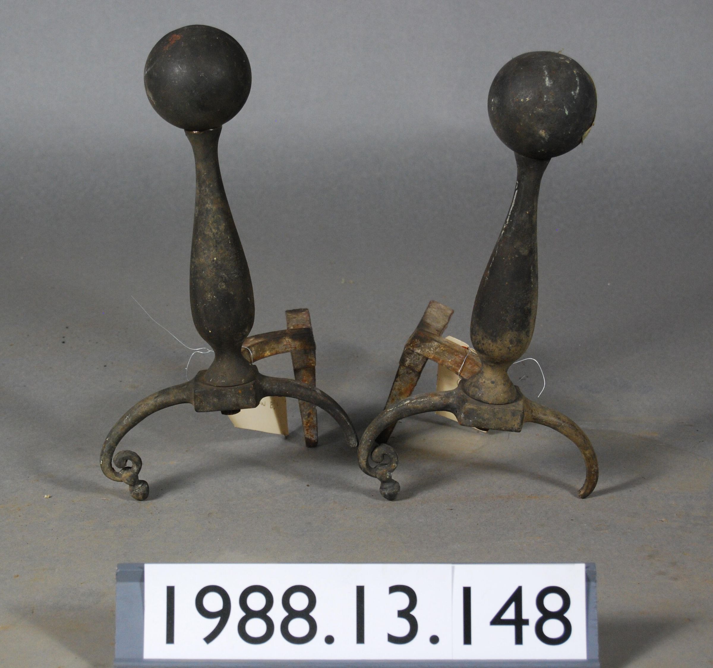 Cast brass pair of andirons. Hollow ball finial. Baluster-shaped spindle. Curved legs. Scroll and ball feet. One foot on each andiron is m0issing. Each andiron has cast iron fire dog bolted on. Both fire dogs are broken, incomplete.