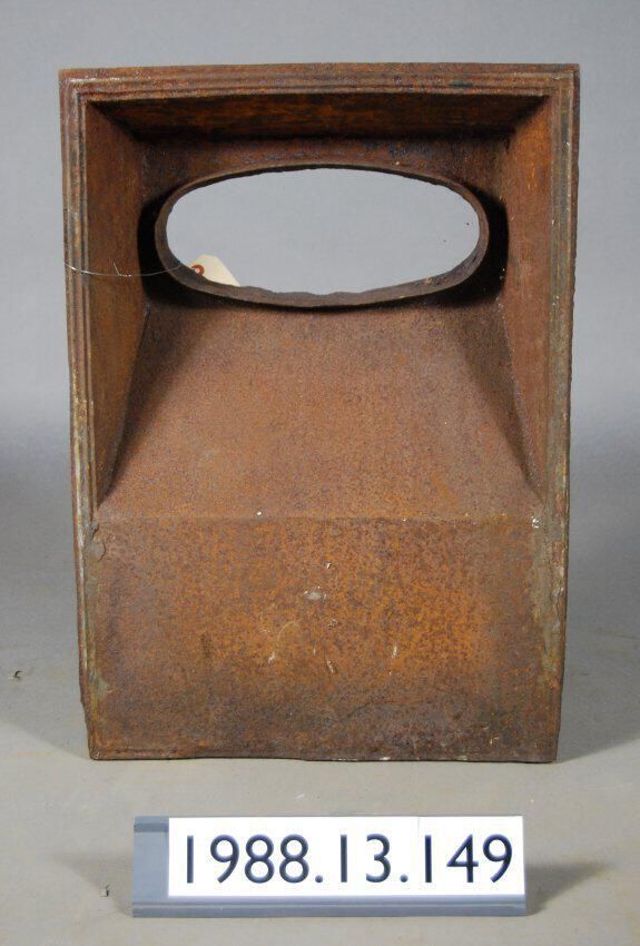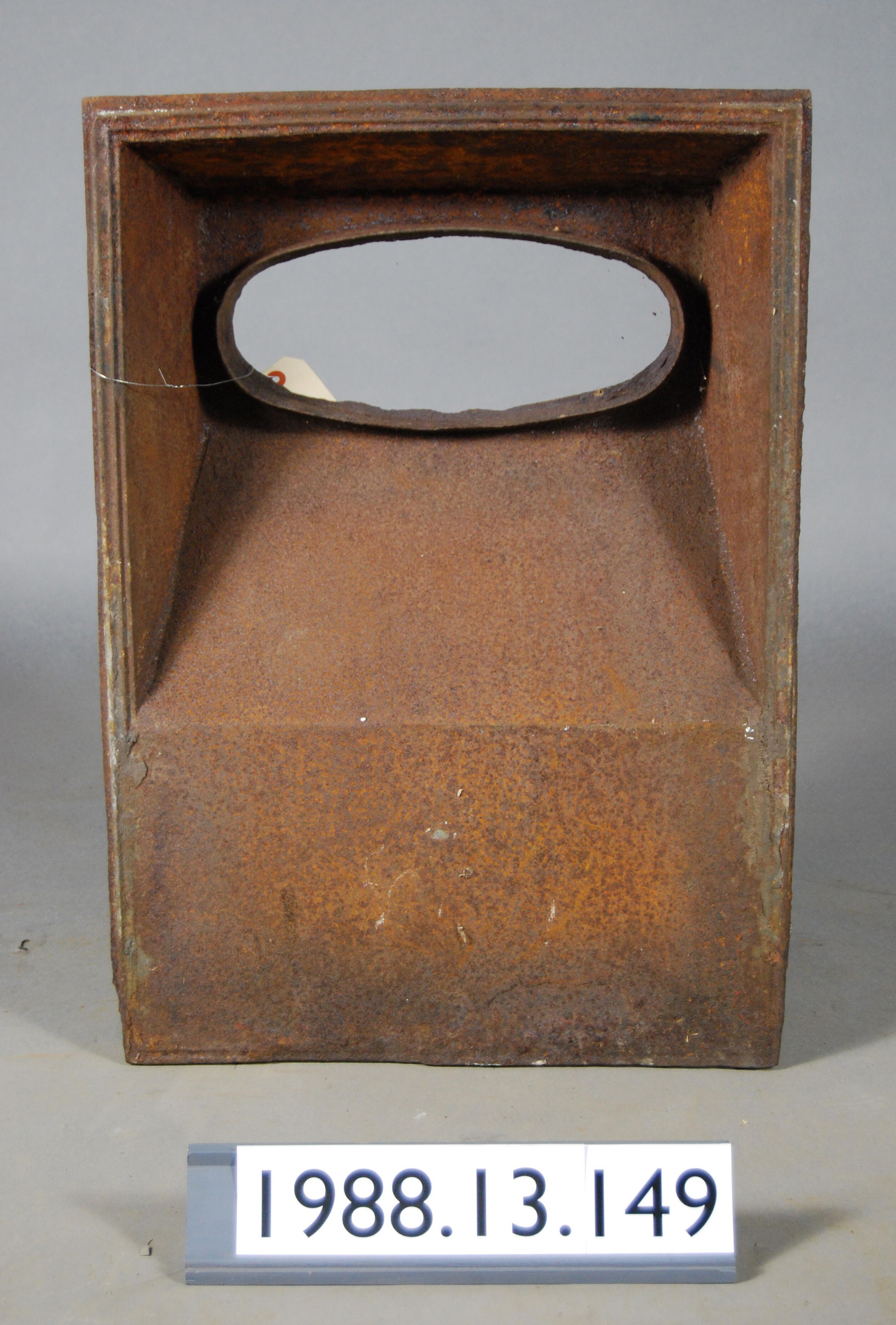 Cast Iron. Rectangular. Lower end has fire box with sloping sides. Back has oval opening with flange. Originally part of coal burning fire place?