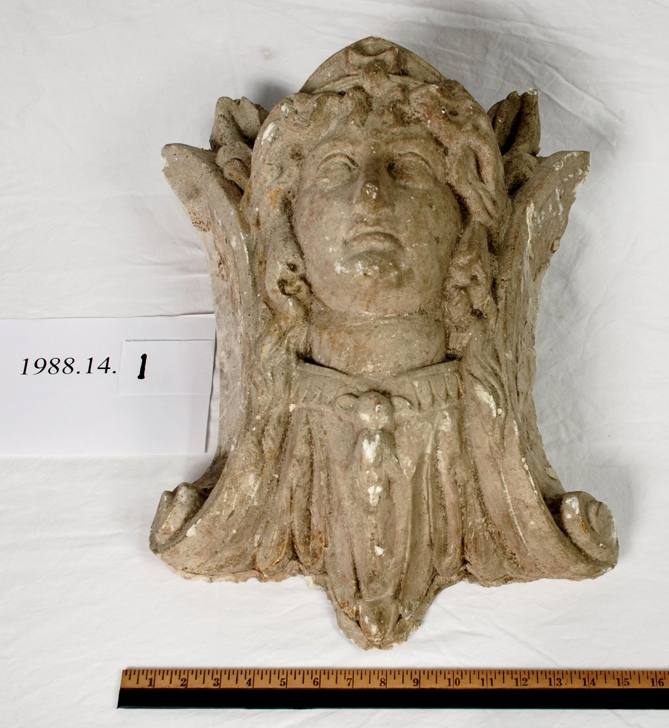 Reproduction molded plaster classic female figure head. Scrolled / leaf decoration at top and sides. Copied from cast iron architectural element from circa 1880.