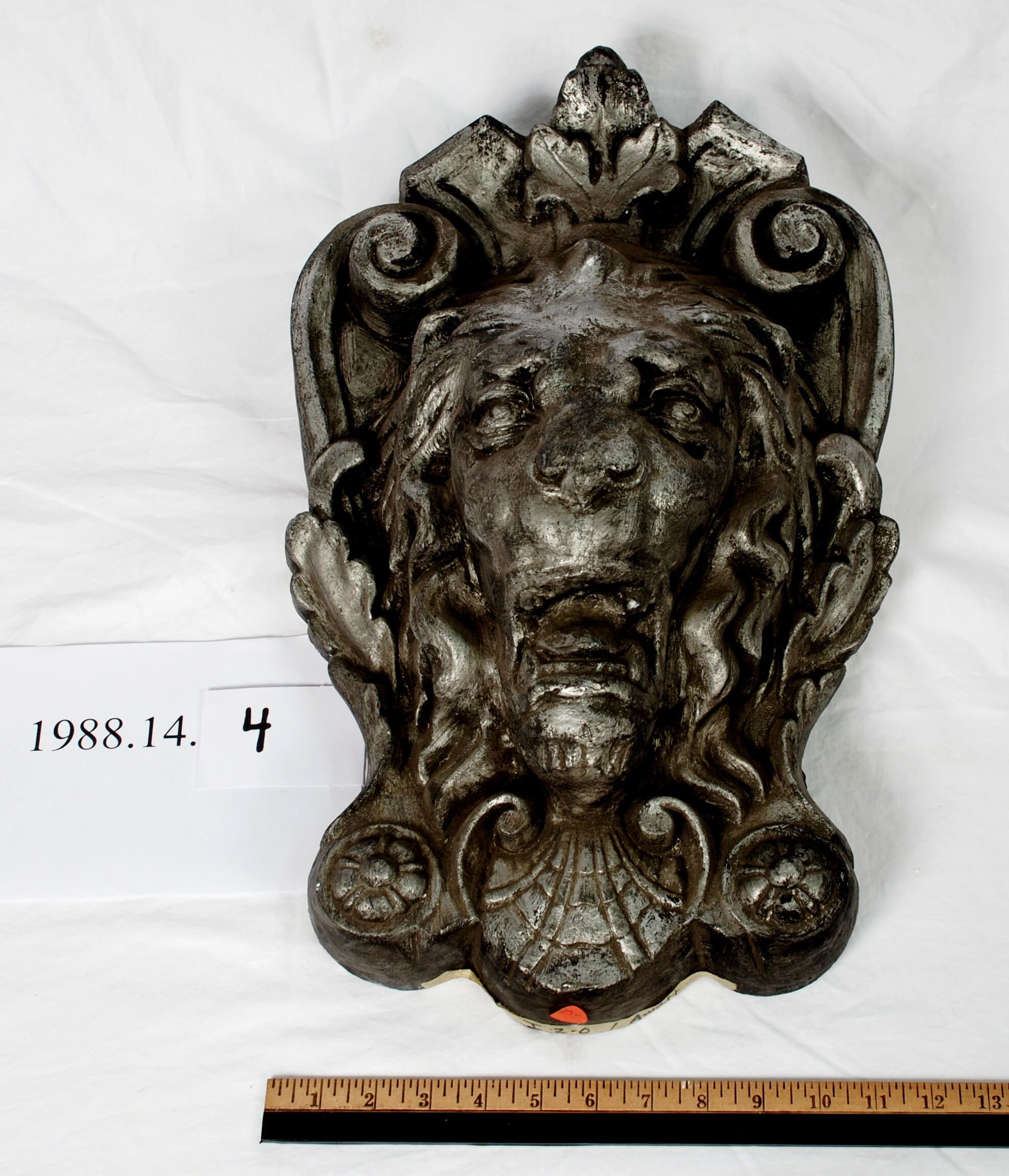 Reproduction molded plaster lion head with scroll / leaf / rosette / scalloped shell motif. Painted antique silver. Same design as 1988.14.3.(molded from cast iron building part see Abington Building. Per Jerry Bosco note, also found on Blagen Block - see photos.)