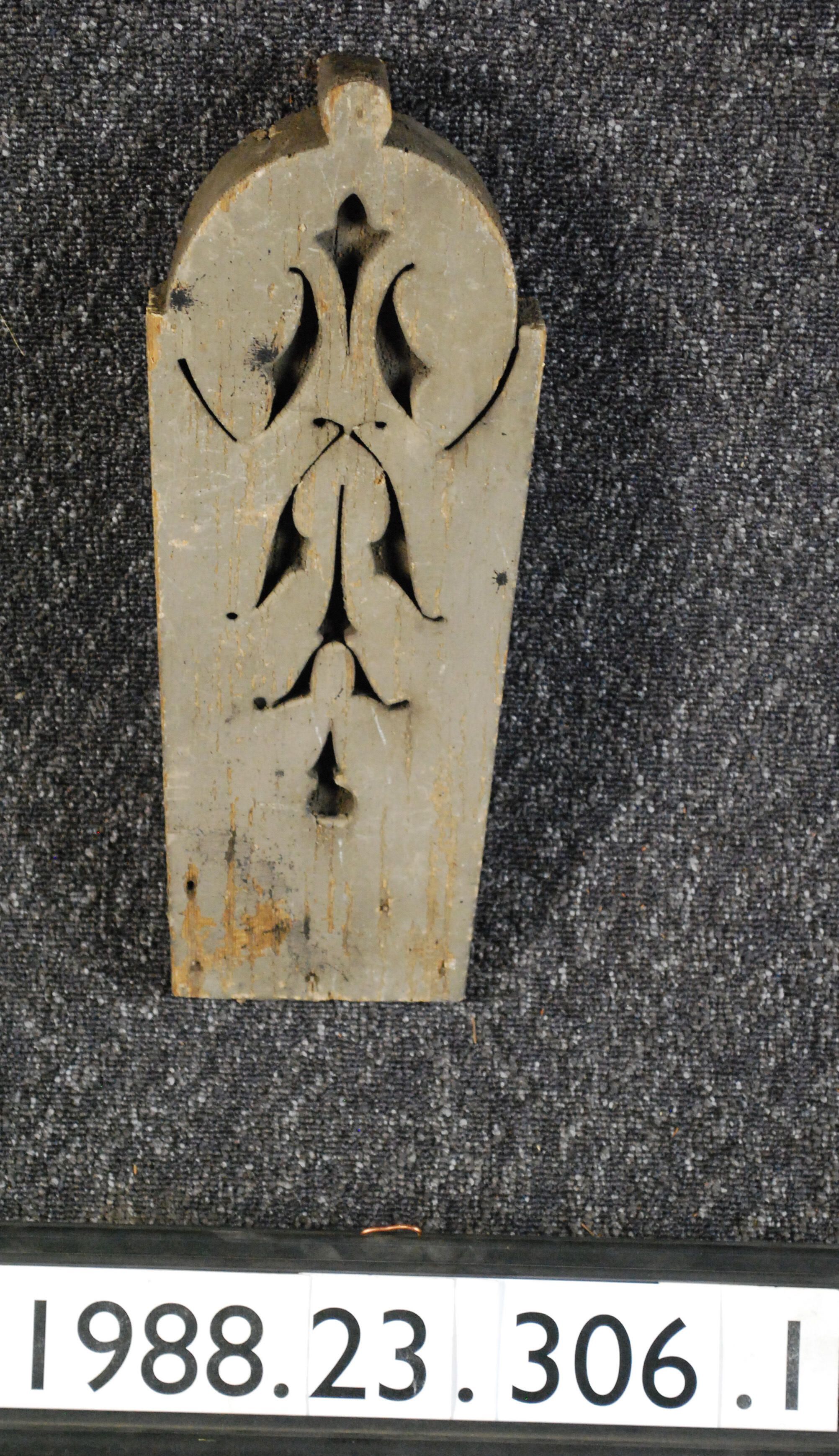 Exterior wood keystone with pierced botanical motifs. Painted greyish-brown. Inscriptions or Markings: Manufacturer: Place of Manufacturer: Design motif: Botanical Style: Finish: Painted Greyish-Brown