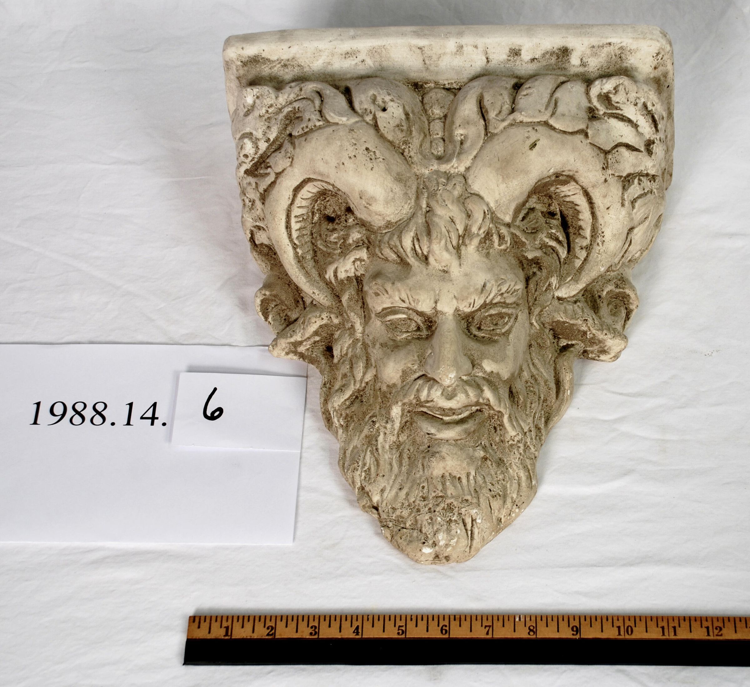 Reproduction molded plaster bracket. Grotesque (Faun). Male head with horns and beard. Wire loops on back.