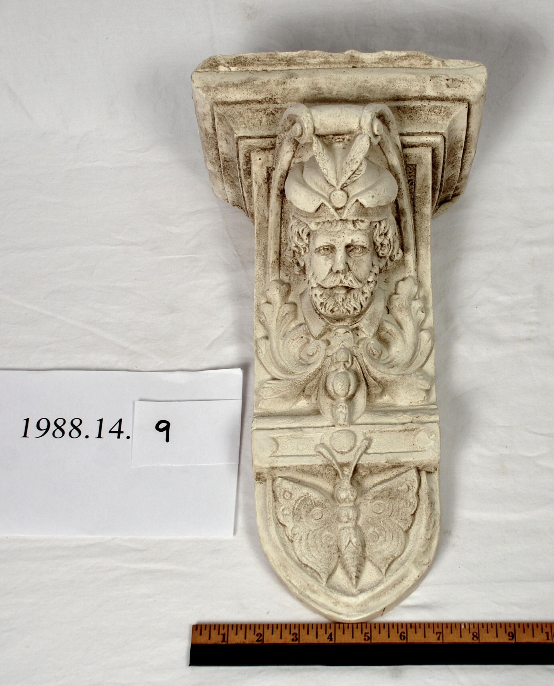 Reproduction molded plaster bracket. (Faun). Rectangular shelf supported by bearded male figure head Scroll / leaf / butterfly motif. Same as 1988.14.8.