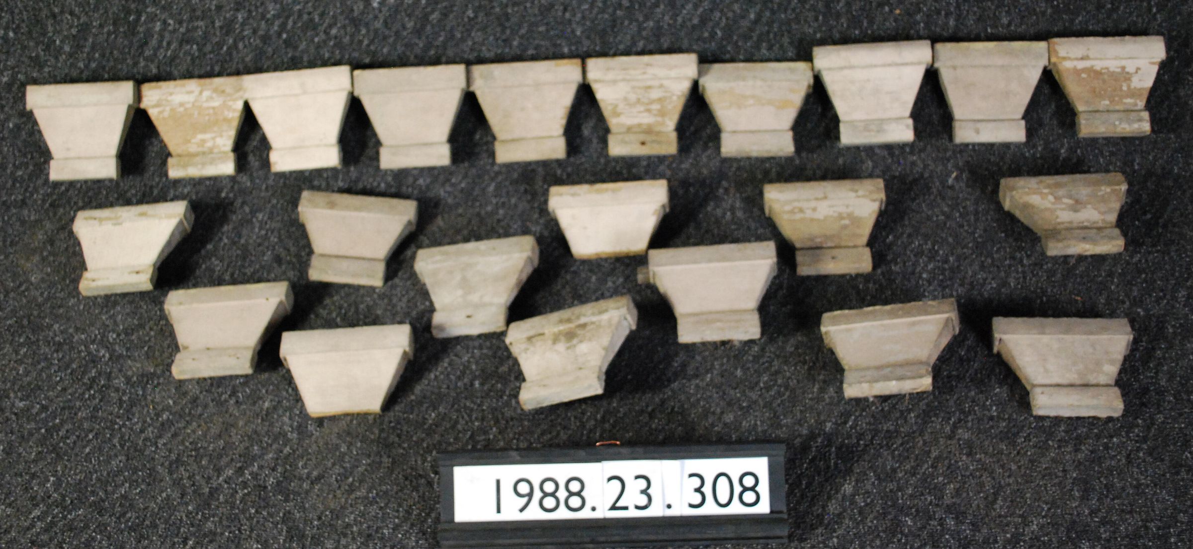 One lot of twenty-two exterior wood ornaments. Tapered block. One of the ornaments is truncated. Painted pinkish / beige.