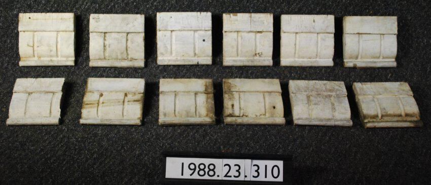 One lot of twelve exterior wood block ornaments. One block is truncated. Painted white. Inscriptions or Markings: Manufacturer: Place of Manufacturer: Design motif: Style: Finish: Painted White