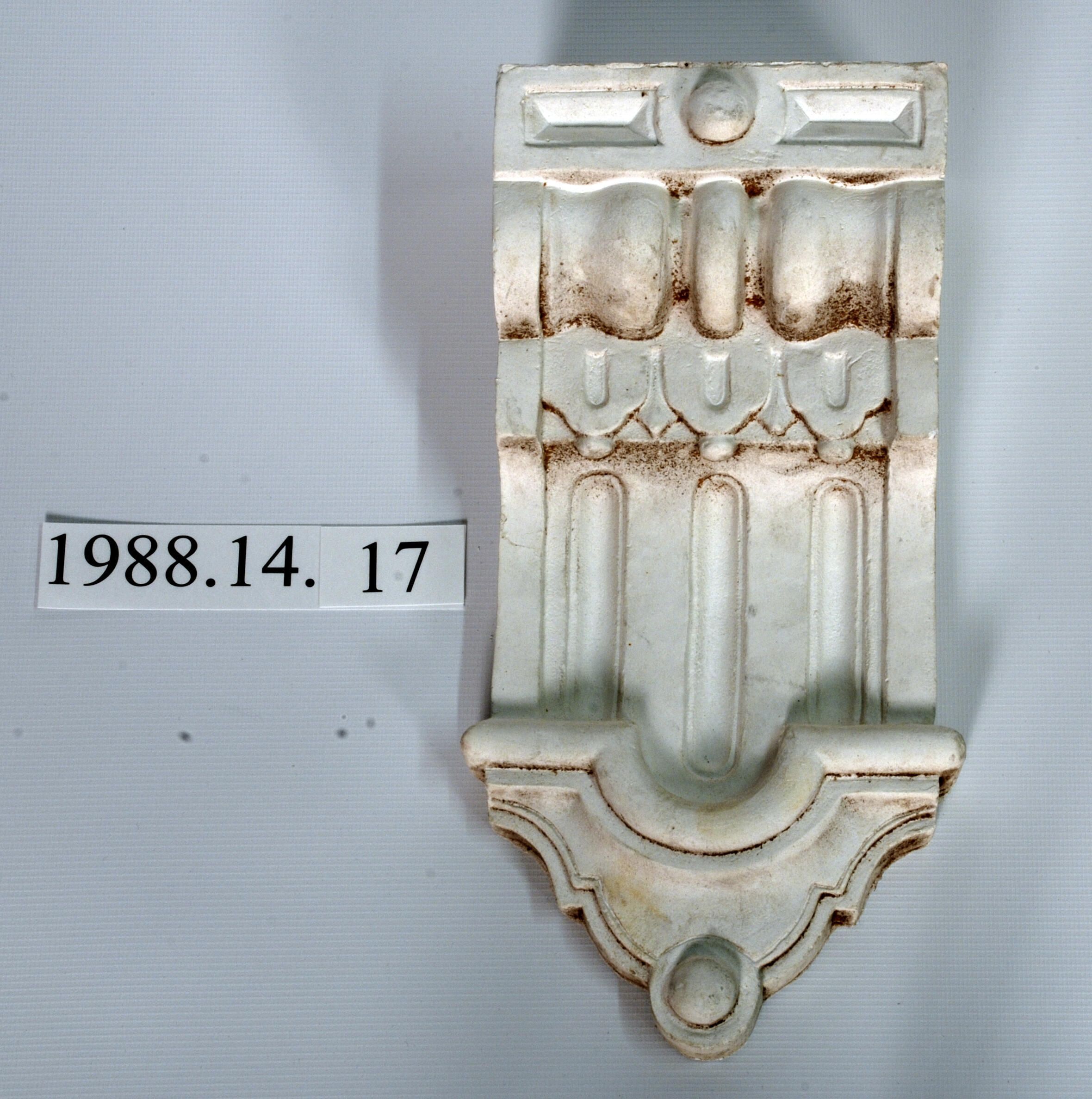 Reproduction molded plaster, classical revival style bracket. Half-turned molding. Dentil band. Vertical flutes, Pendant lower end.
