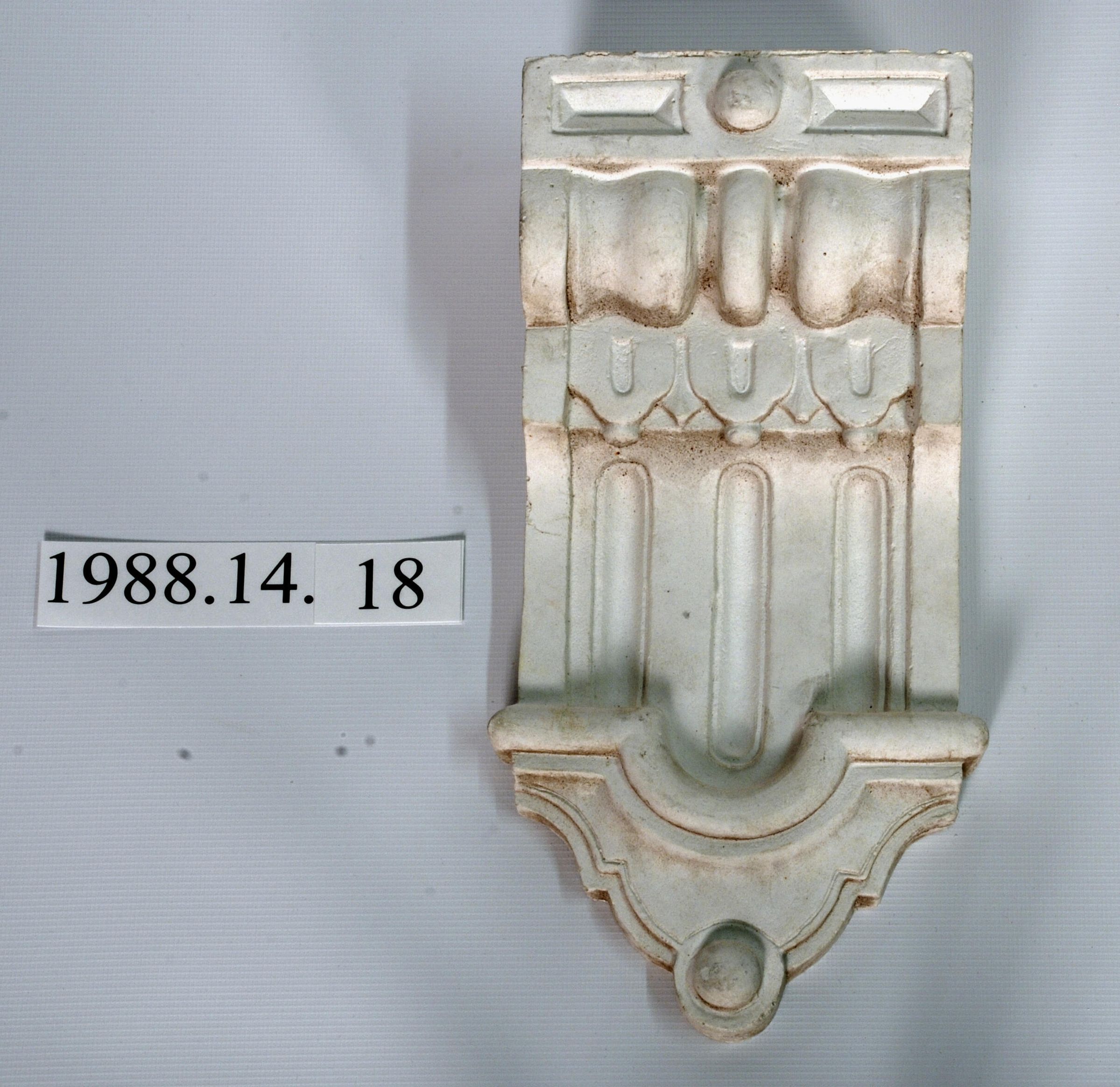 Reproduction molded plaster, classical revival style bracket. Half-turned molding. Dentil band. Vertical flutes, Pendant lower end.