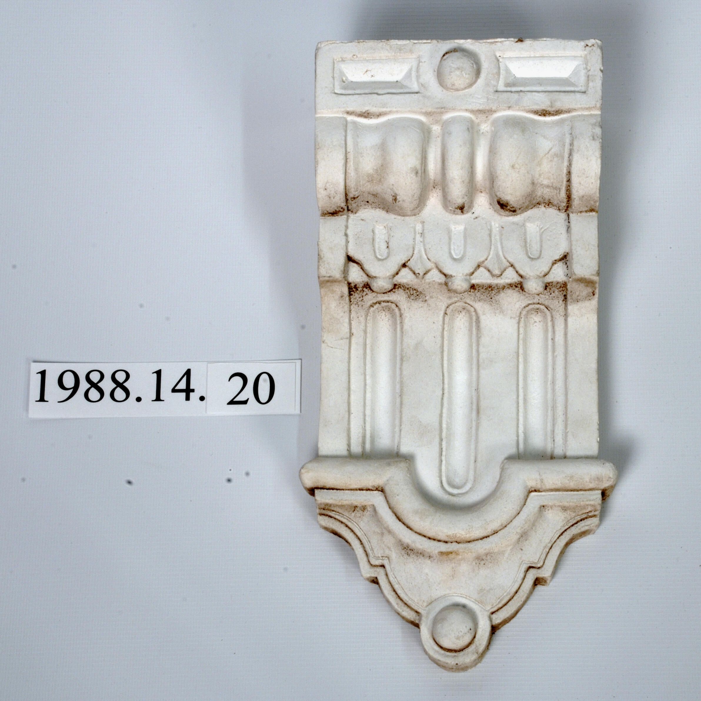 Two reproduction molded plaster, classical revival style brackets, (A) and (b). Half-turned molding. Dentil band. Vertical flutes, Pendant lower end. (Bracket (B) broken).