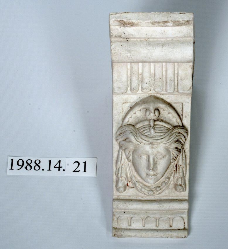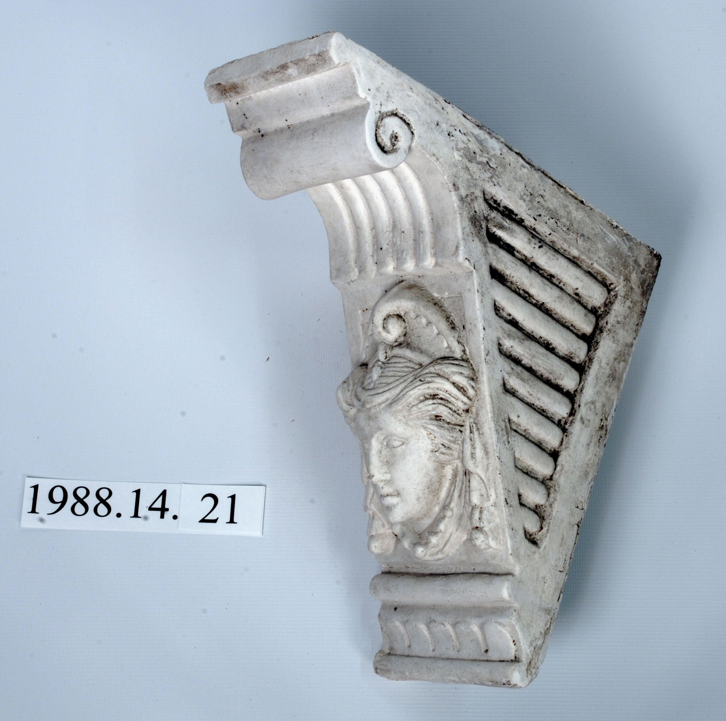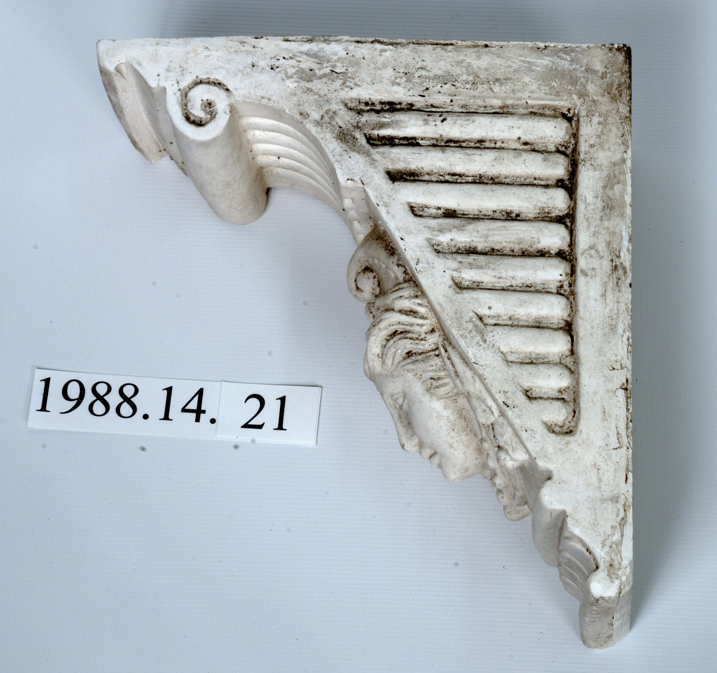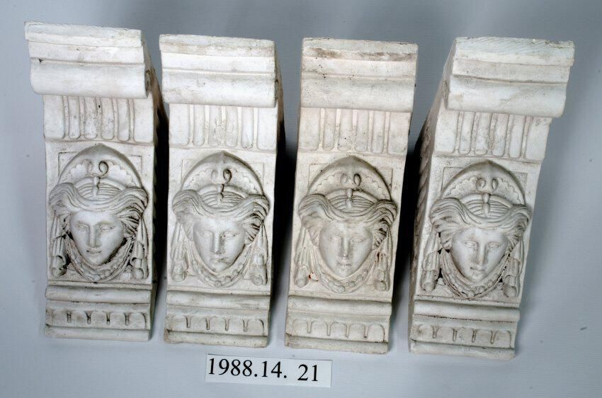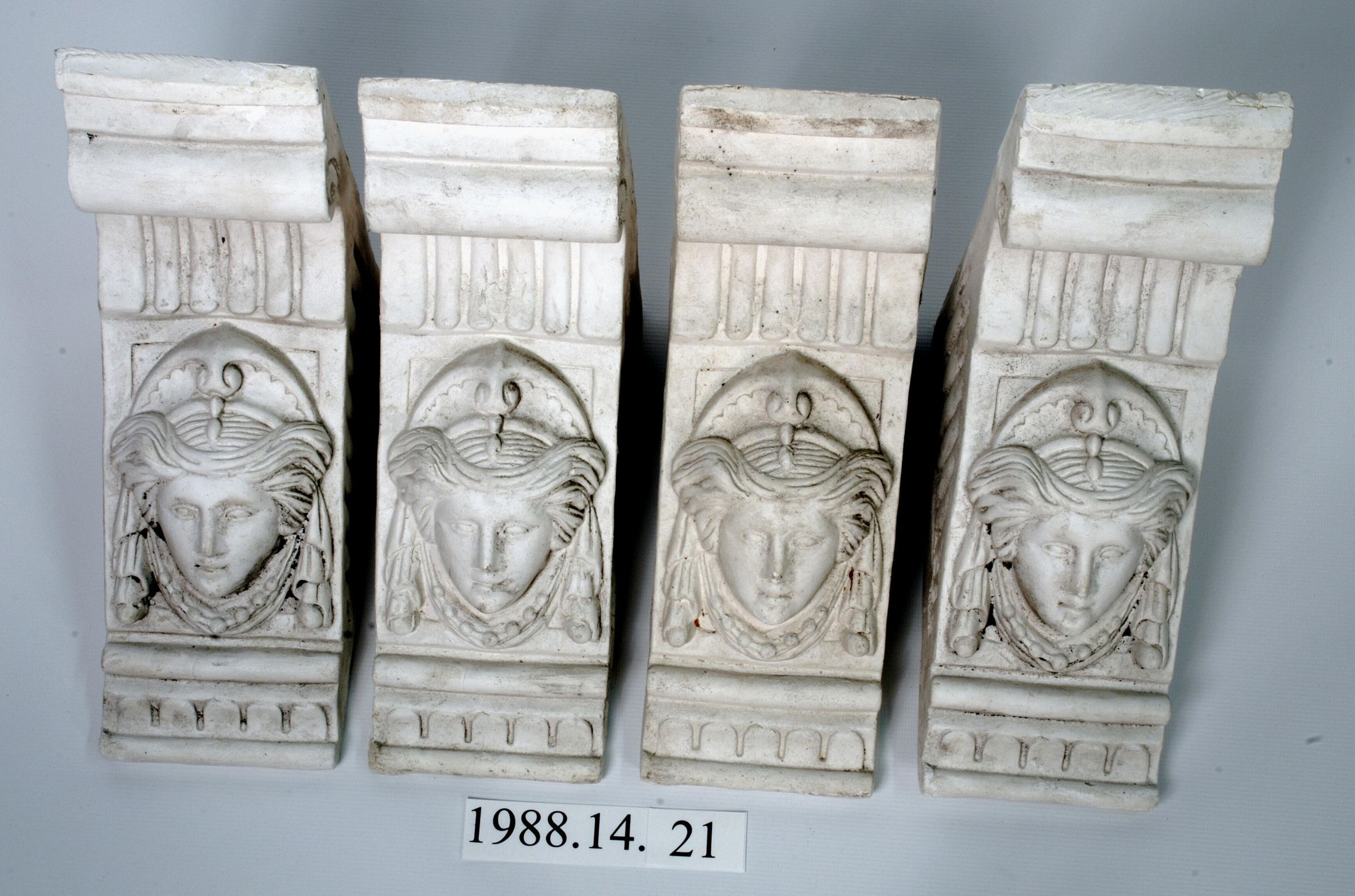 Reproduction molded plaster. Four brackets. Scrolled molded fluted sides / front. Central classical revival relief female figure head (portrait). Has foam filled backing.
