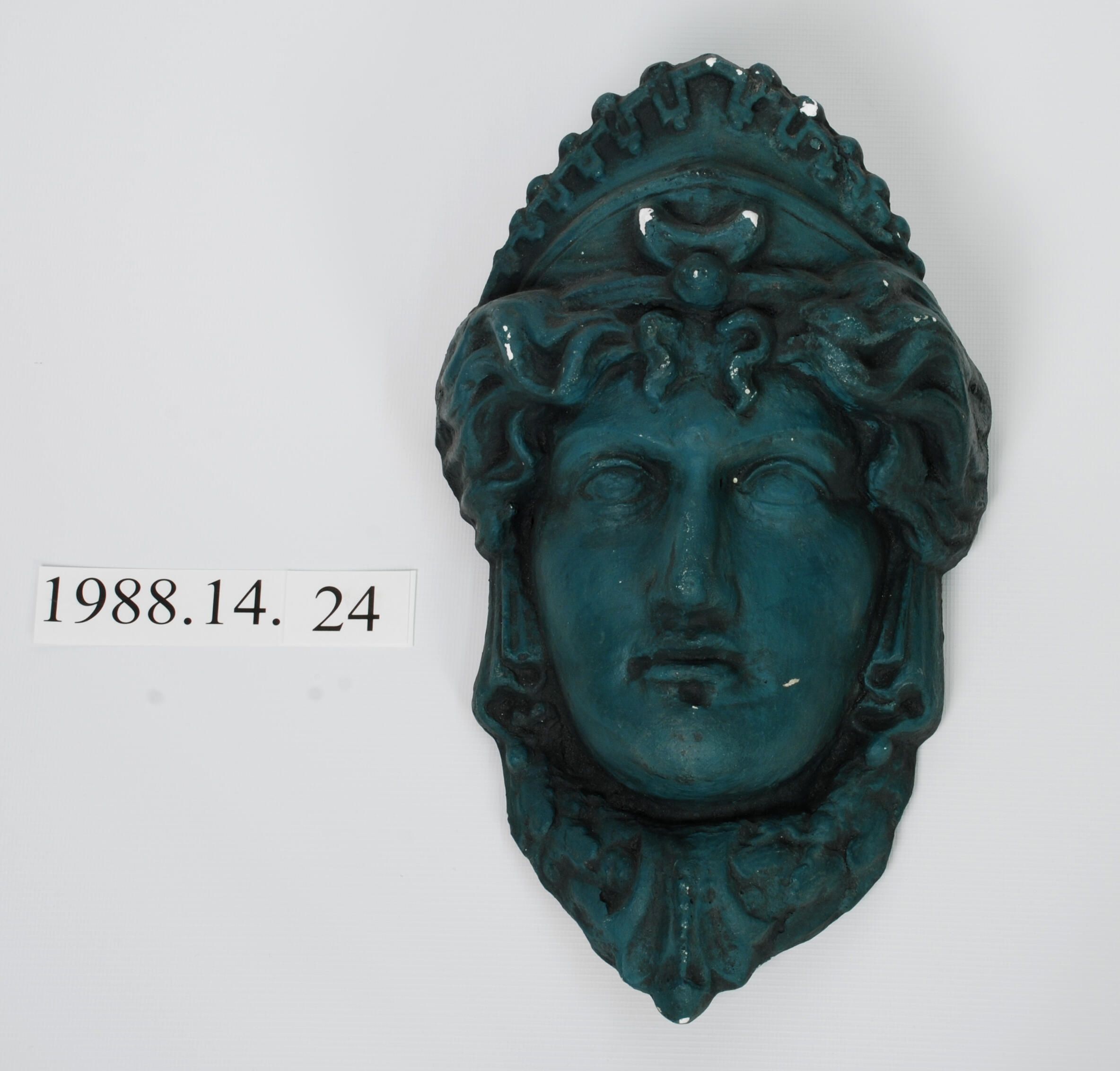 Reproduction molded plaster. Classical Greco-Roman female figure head with tiara. Painted dark greenish blue. (Minor chips). Similar to "Minerva" found on Merchant Hotel and Blagen Block. (See Jerry Bosco photos.)