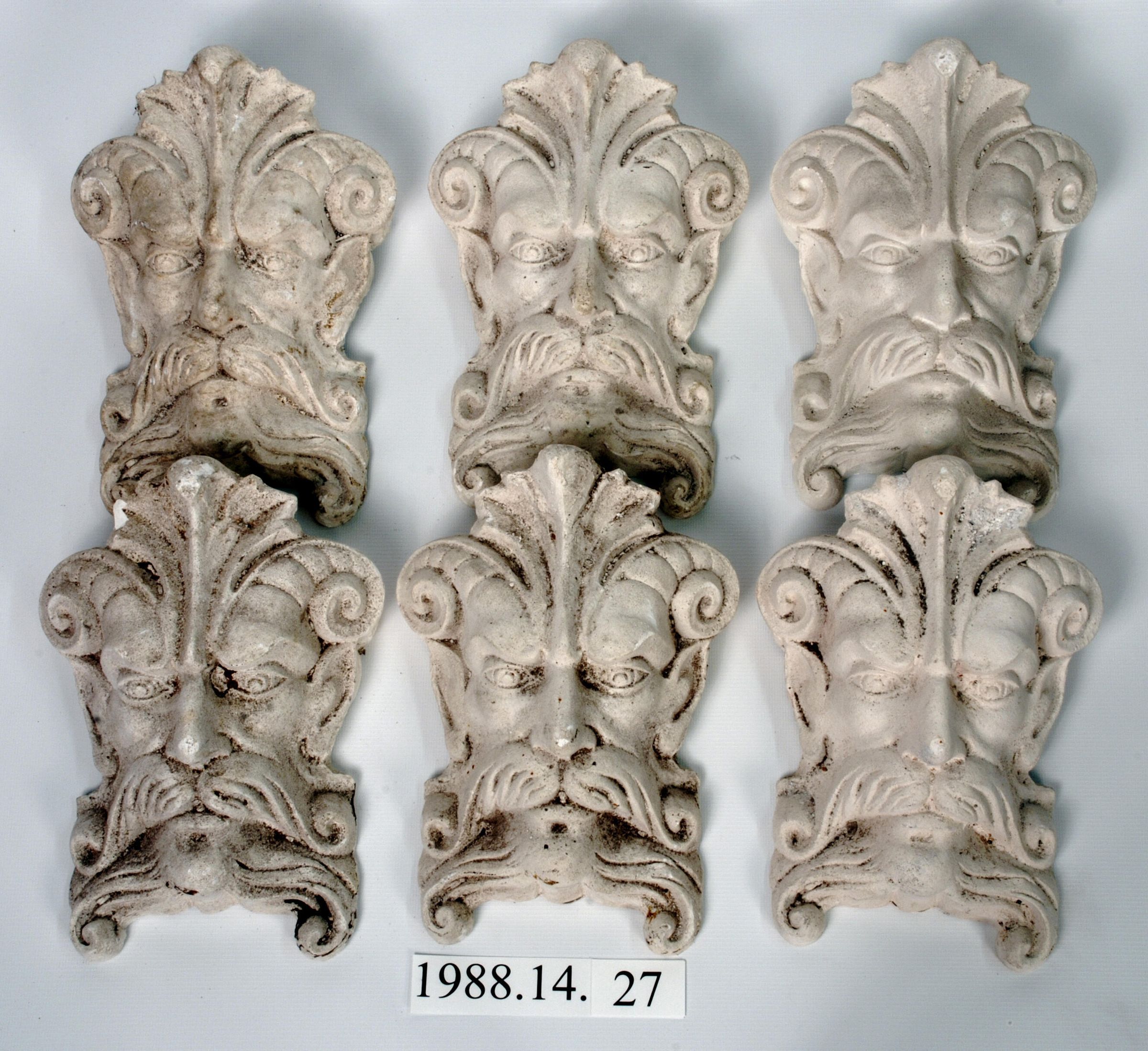 Reproduction molded plaster. One lot of seven grotesque male horned figure heads. (Faun).Copied from cast iron pattern