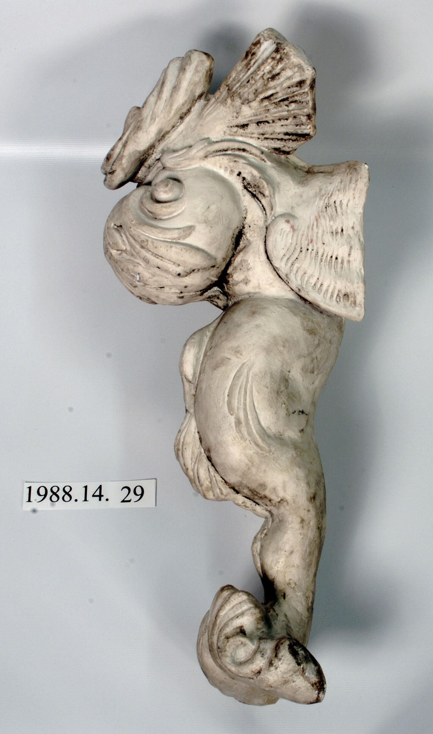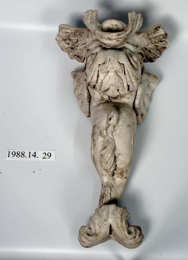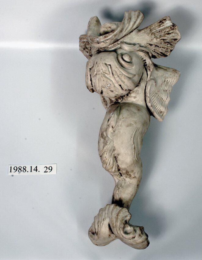 Reproduction molded plaster. Dolphin: Classical, stylized figure with fluted tail, serpentine body, bulbous eyes and projected tongue. Projections on either side of arched mouth.