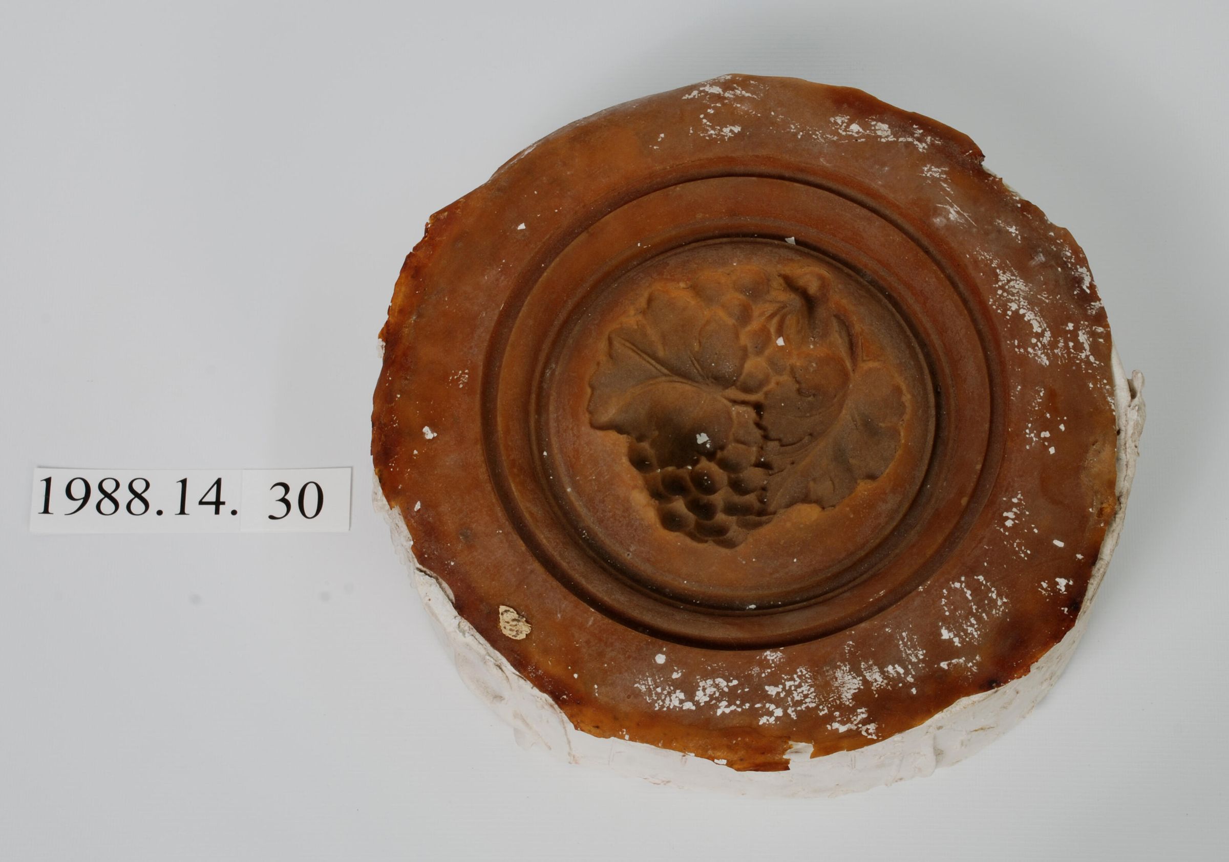 Rubber facing with plaster mother mold to cast flue stopper. Grapes, grape vines center relief. Rim surround. See 1988.14.31 - 1988.14.
