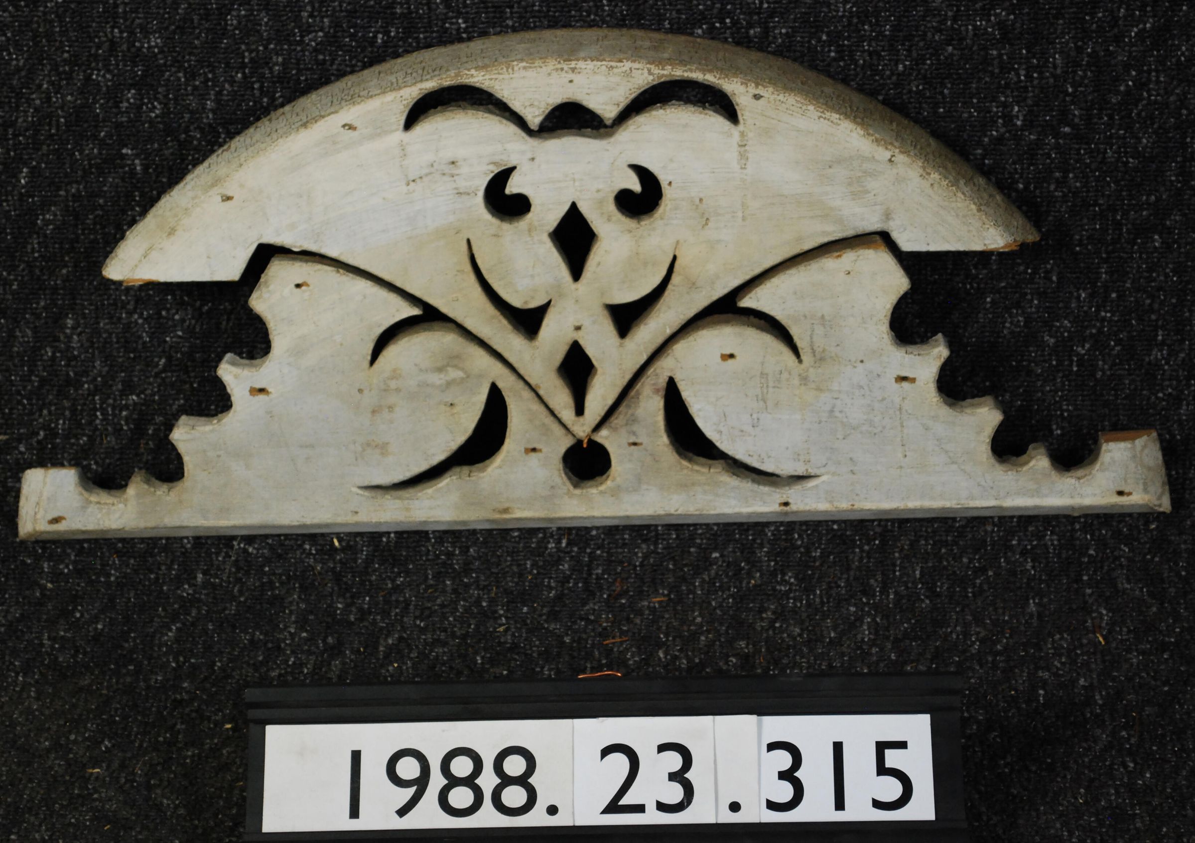 Exterior wood fret-sawn ornament. Arched top. Originally one piece - now broken and incomplete. Probably part of window header trim. Painted off-white.