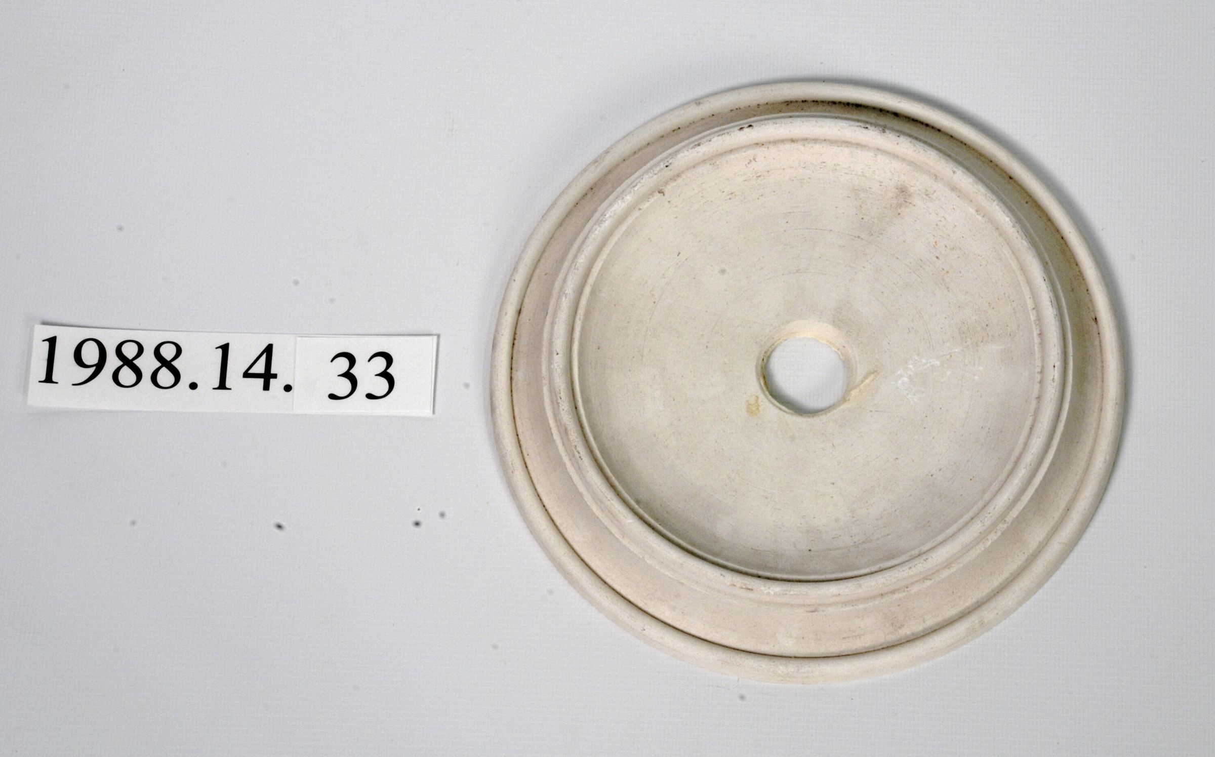 Reproduction molded plaster. Casting of flue stopper. Smooth on back. No ornamentation. Rimmed in smooth circular bands. See 1988.14.30 - 1988.14.32, and 1988.14.34 - 1988.14.36.