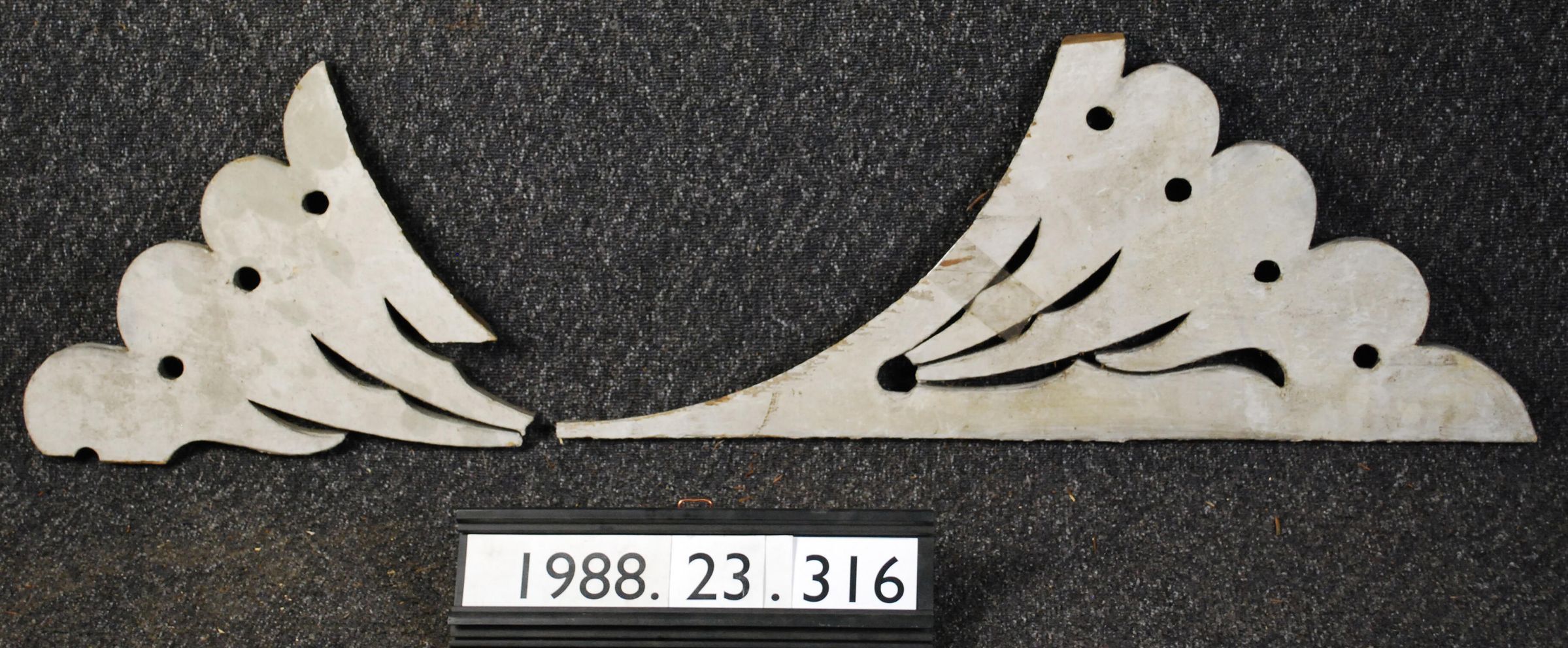 One lot of two exterior wood fret-sawn ornaments. Both are incomplete. Painted off-white.