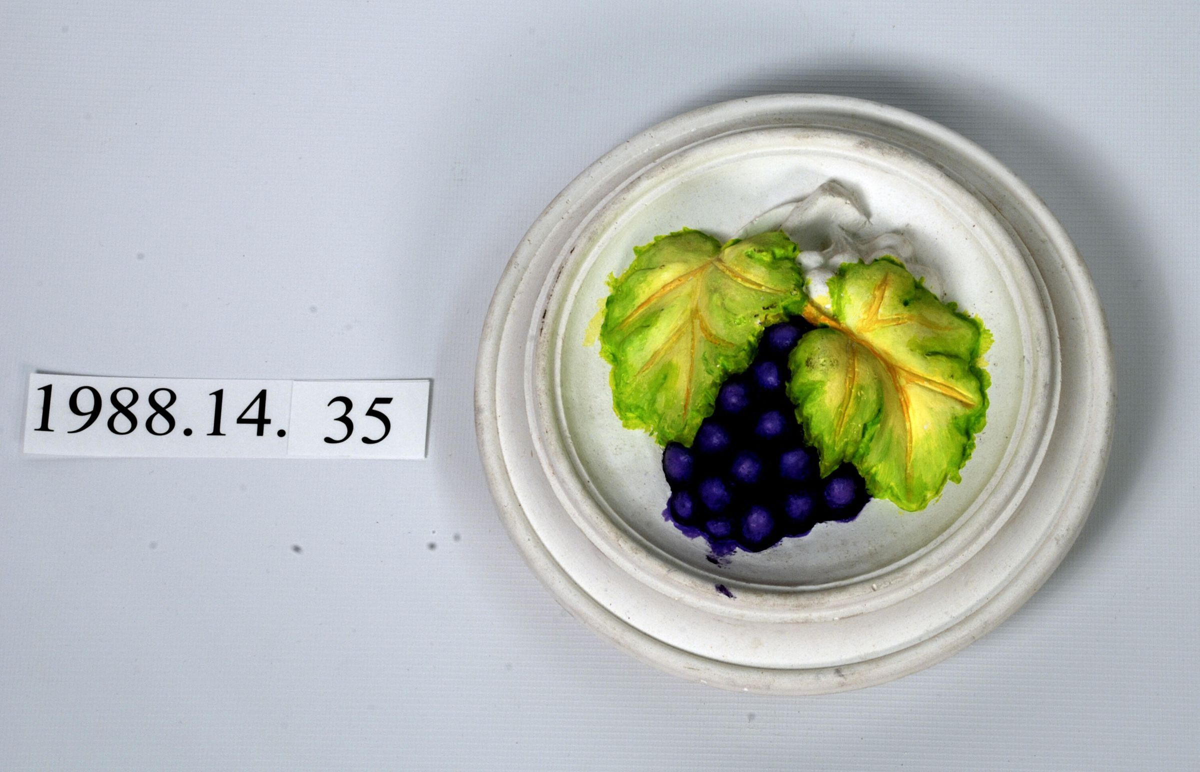 Reproduction molded plaster. Casting of flue stopper. Metal prongs secured in back. Relief center of grapes and grape leaves. (Polychrome decorated). Rimmed in smooth circular bands. See 1988.14.30 - 1988.14.34, and 1988.14.36.