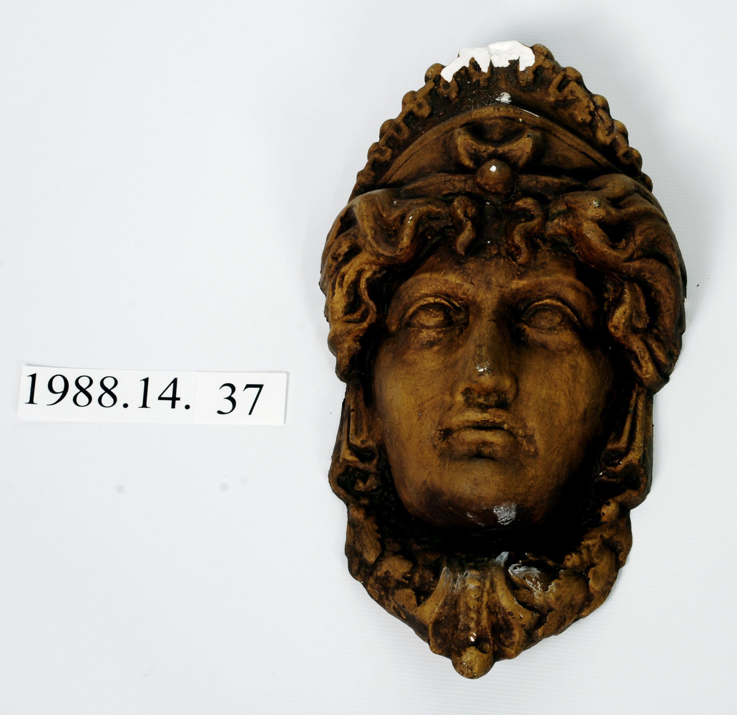 Reproduction molded plaster. Classical Greco-Roman female figure head with Tiara. Painted yellow base with brownish highlights. Minor chips. Similar to "Minerva" found on the Blagen Block. See Jerry Bosco's photos.