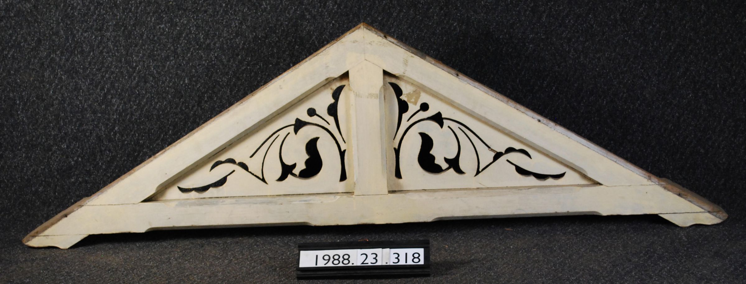 Exterior wood bargeboard. A-Frame with two recessed panels. Each panel has fret-sawn ornamentation. Painted beige. Inscriptions or Markings: Manufacturer: Place of Manufacturer: Design motif: Style: Finish: Painted Beige